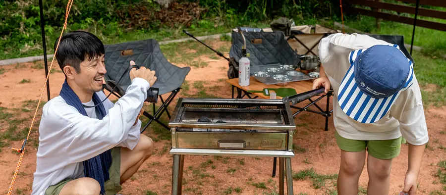 浅田政志さん、朝日くんがBBQ準備を楽しんでいる様子をパチリと写真に納めます。