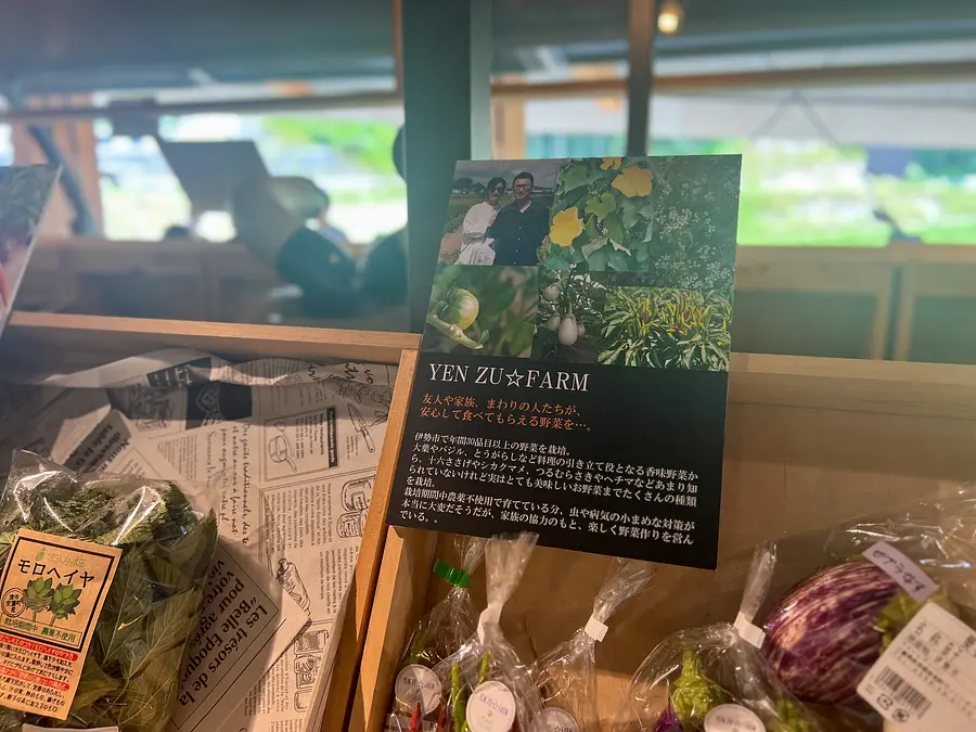 「むらごとマルシェ」が開催されている広場の近くに、とても大きな三角屋根の建物があります。この一角にあるのが「マルシェ ヴィソン」。毎日、三重県産の採れたてのお野菜や果物が並びます。
