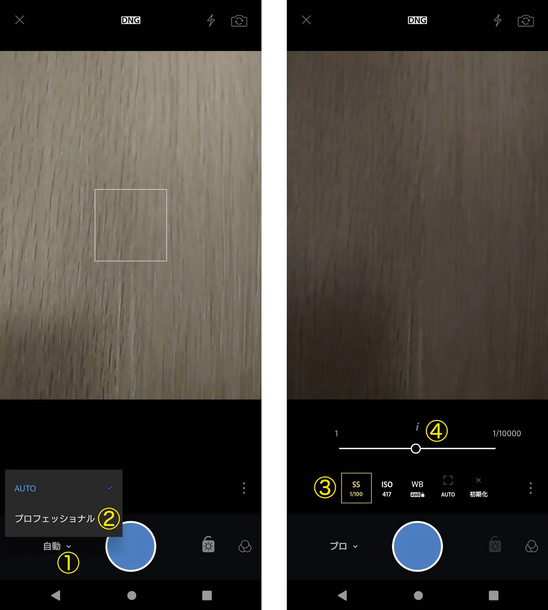 カメラが起動したら①「自動」をタップするとAUTOかプロフェッショナルが選べるので②「プロフェッショナル」を選択します。