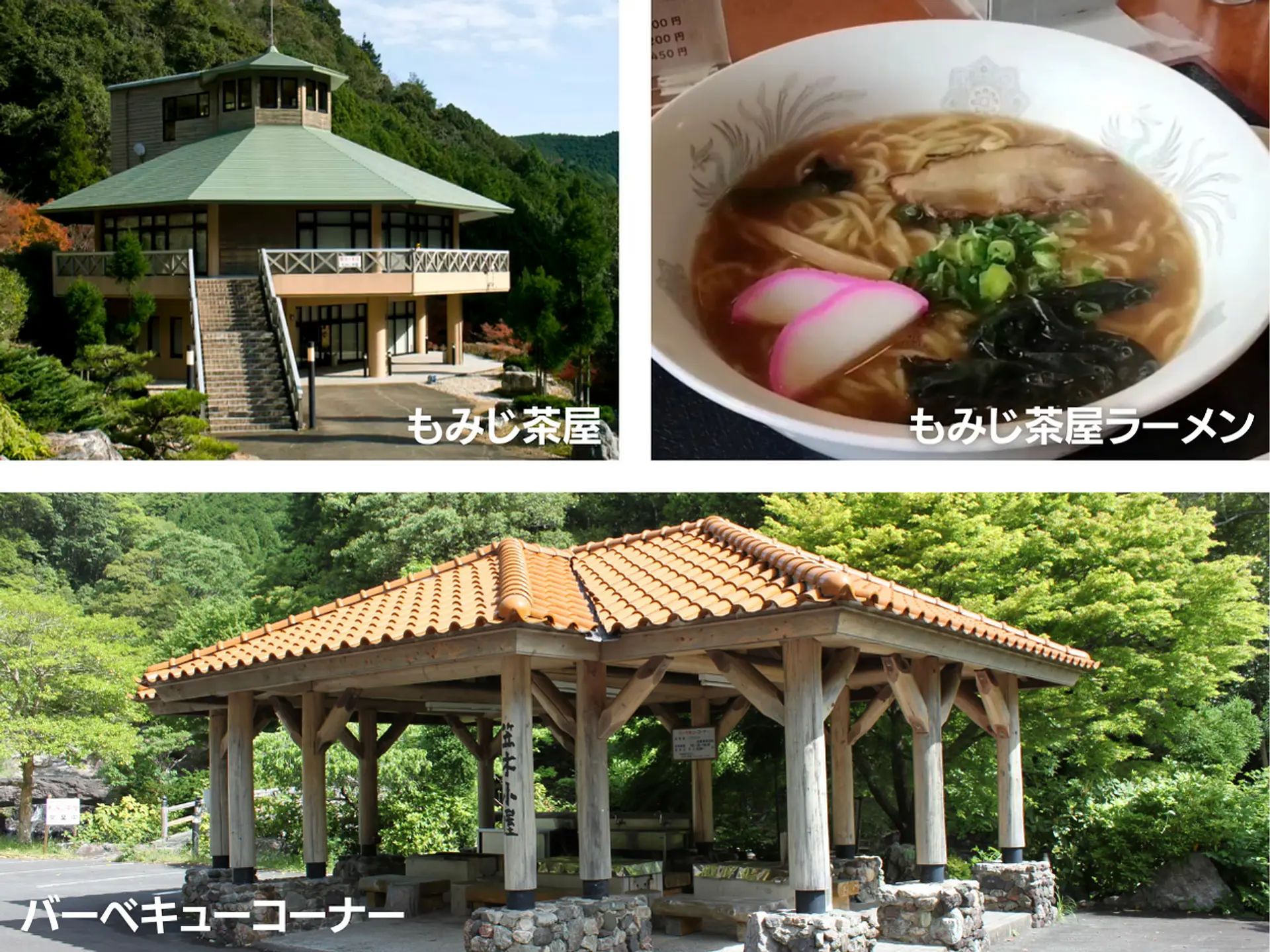 休憩所である喫茶「もみじ茶屋」では麺類などの軽食を提供するほか、バーベキューコーナーなどもあり、ファミリーやグループにも人気です。