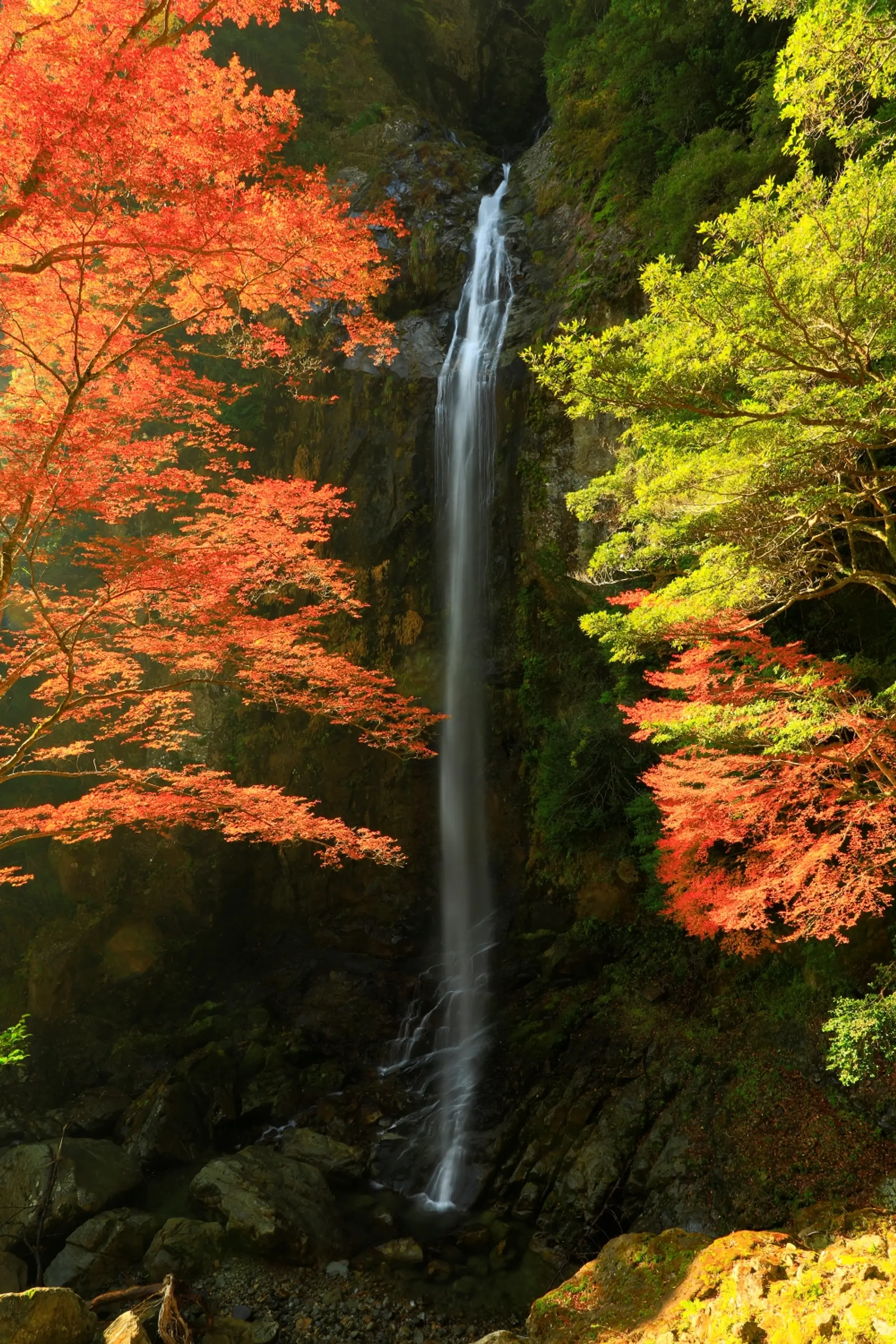 滝を眺められる谷にはもみじの木があり、美しい滝と紅葉との共演は贅沢そのもの。