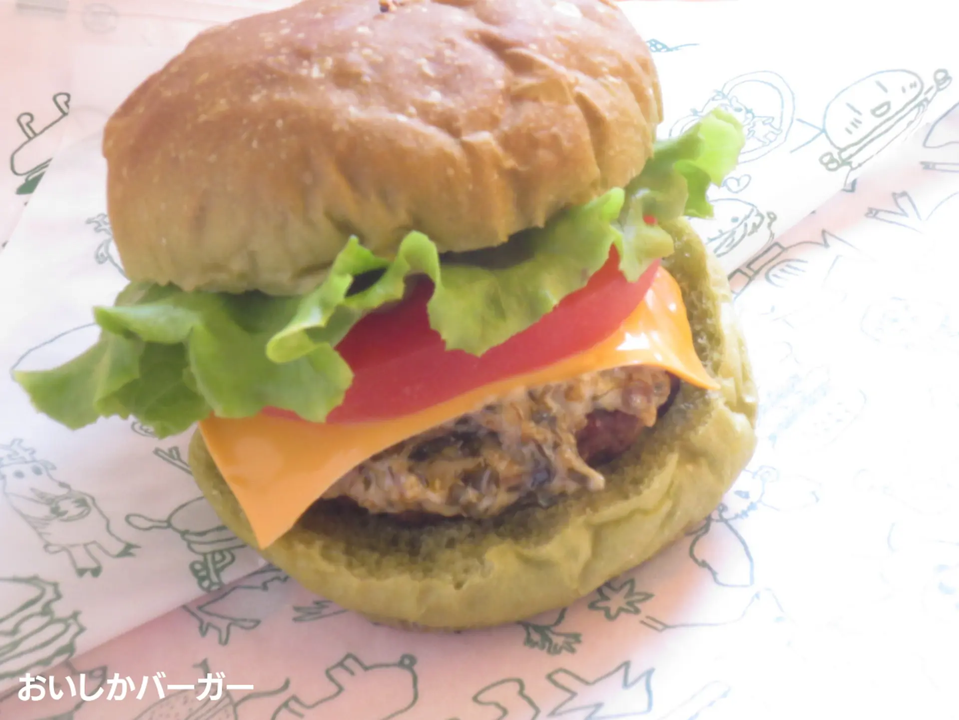 大台茶を練りこんだ抹茶色のバンズに、鹿肉のパテと地元産の野菜、チーズが挟まれています。