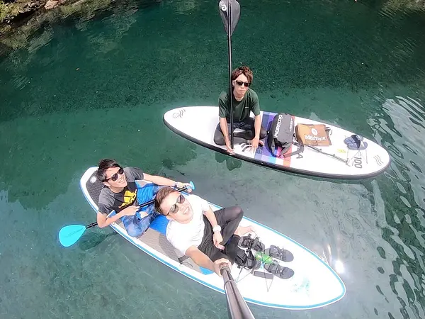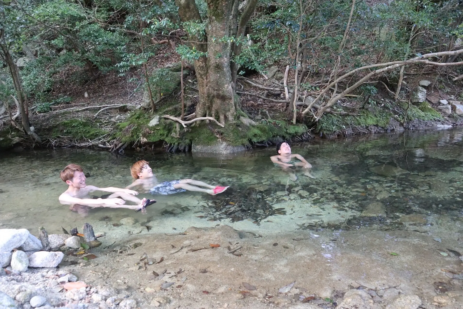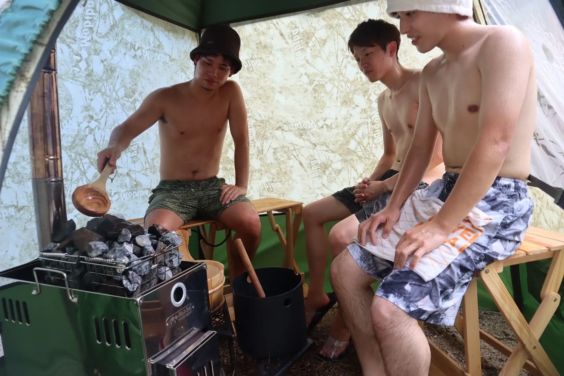 サウナで熱くなった体を、目の前の川でクールダウン。これぞ”ととのう”!!見てください、3人のこの気持ちよさそうな顔・・・! 晴れている日は水かさが浅く、座って丁度いい深さです。寒い日は掛水をしてから入水すると体への負担を減らすことができます。季節によっては普通のサウナ施設では珍しいシングルを味わうことができるのも川ならではの特徴です!