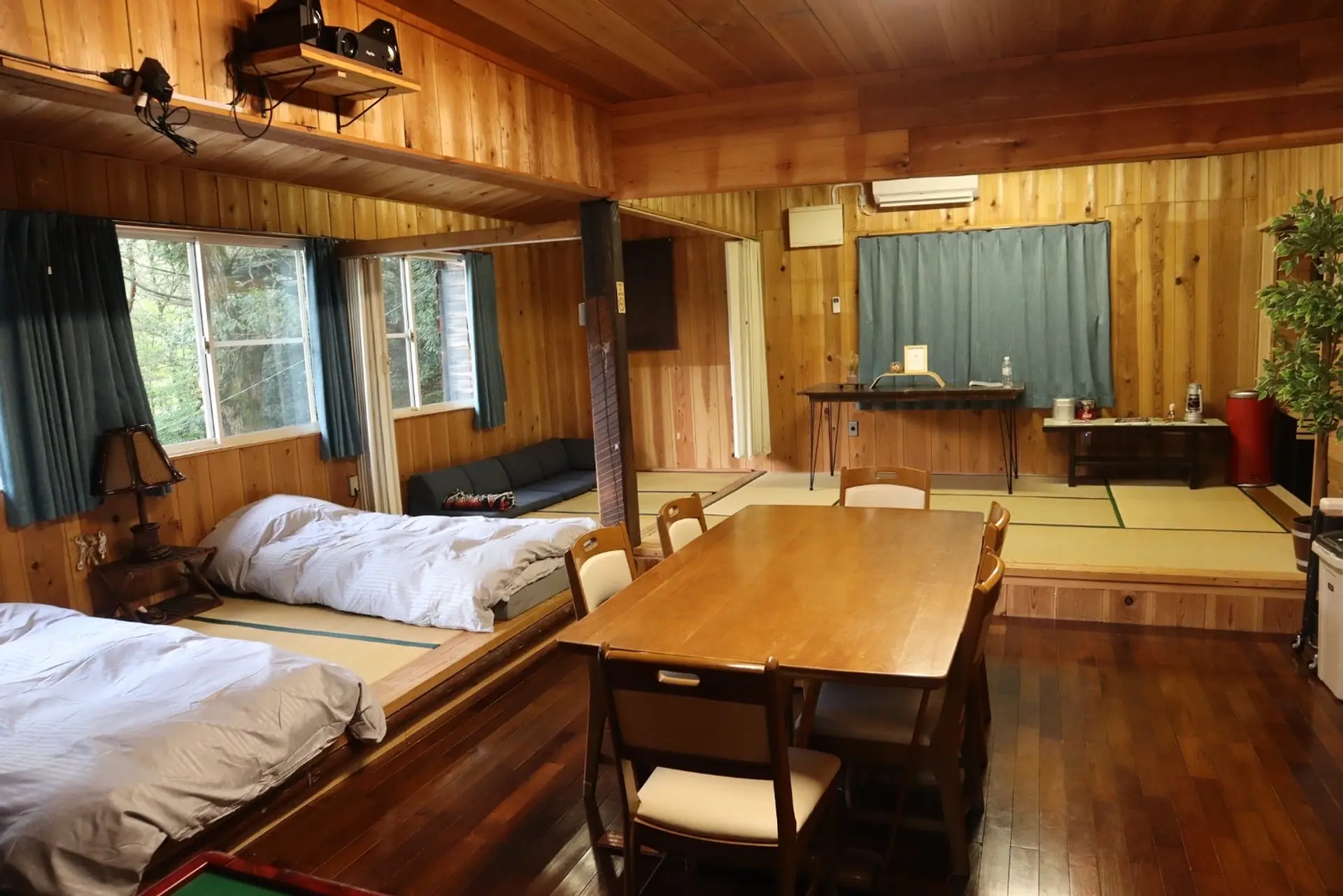 次は山荘の中を覗いてみましょ〜!入ってすぐに大きなダイニングテーブル、そして畳みの間が広がります。宿泊は1日1組限定で、最大7人まで利用することができ、みんなでワイワイするのもよし!登山の疲れを癒すのもよし!「木」の空間で自然を心ゆくまで堪能できる山荘です。