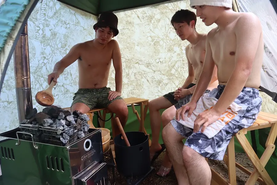 サウナの中の様子です。アツアツの焼石にアロマの入った水をかけると一気に熱気と香りがサウナ中に広がります。代謝が上がり、しっかり汗をかくことで体の調子を整え、美肌効果も得られます。レンタルテントサウナは服を着ての利用も可能です。