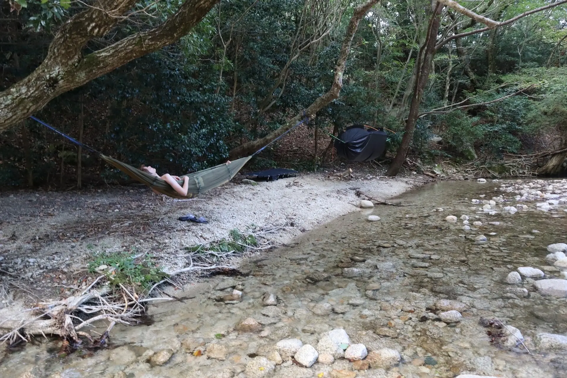 ハンモックも貸し出ししており、近くの木につけて休ませていただきました。これもまた至高。川のせせらぎをBGMに外気で体を休めることができます。至れり尽くせりのこの空間を、ぜひ体験しに来てください!