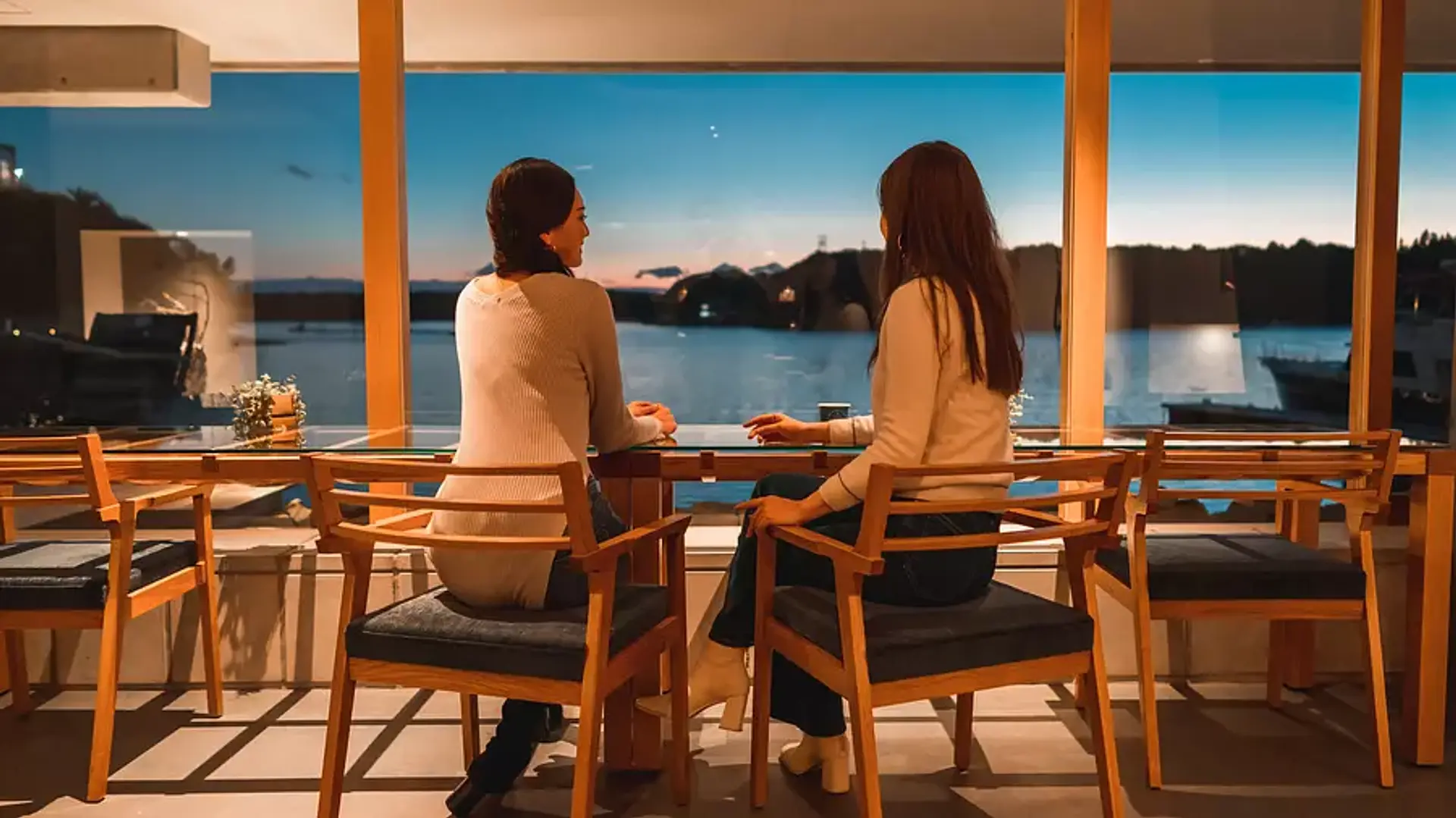 「SAZANAMI Lounge」は窓際の席から英虞湾を一望でき、コーヒー、紅茶、アルコール、ジュースなどを自由にいただけるセルフラウンジです。