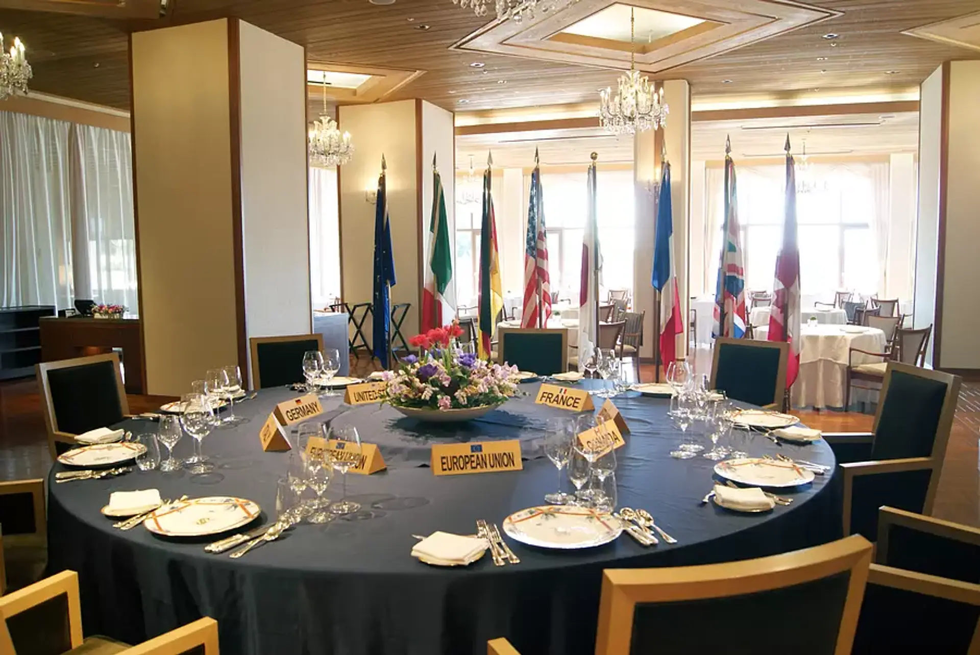 「志摩観光ホテル ザ クラシック」レストラン内には、サミットの際、各国首脳が実際に食事を楽しんだテーブルが再現されています。
