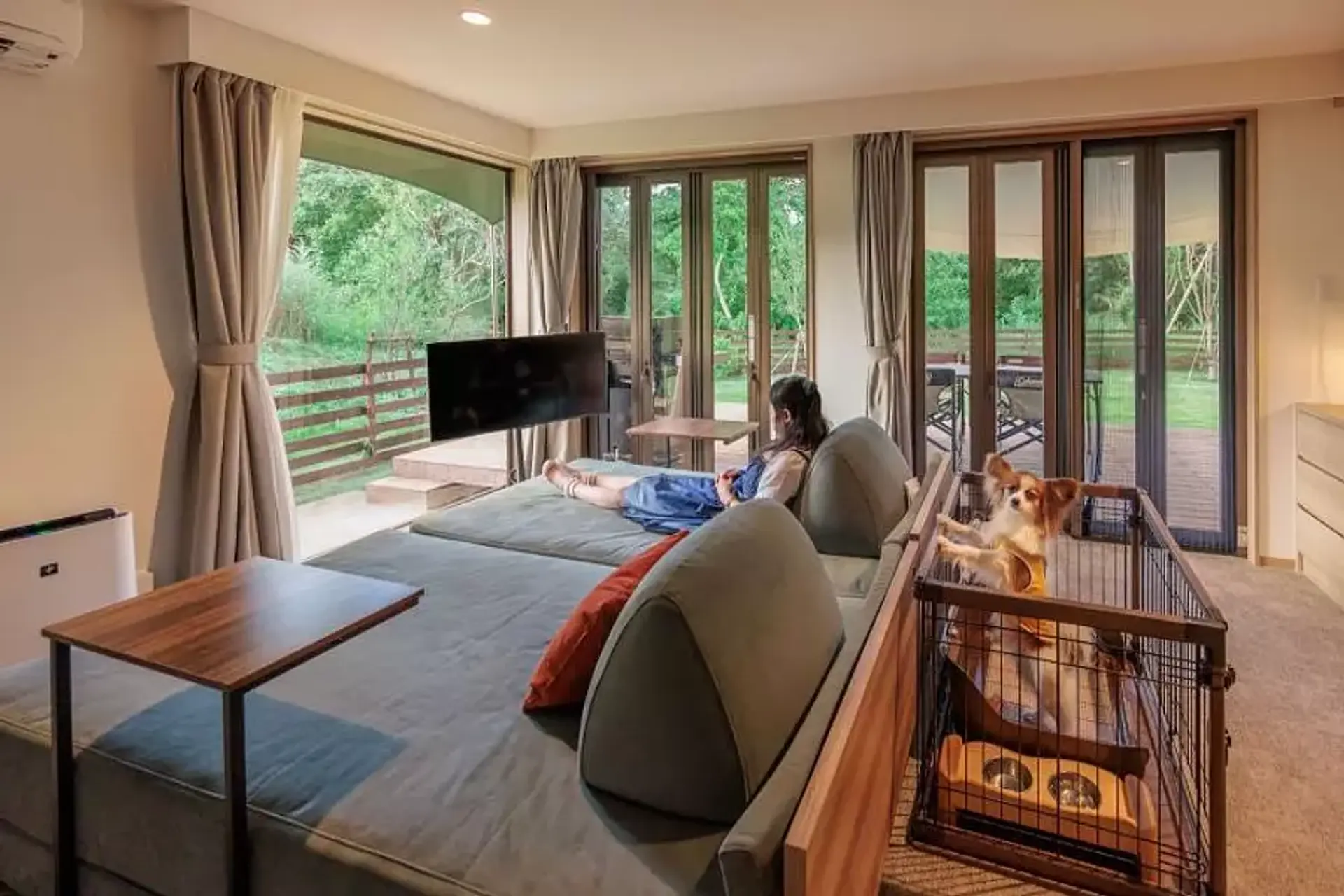 各ヴィラにはウッドデッキと専用の庭があり、ワンちゃんと泊まれるヴィラにはケージやトイレシート、飲食用の器など、ワンちゃん用の備品も充実しています。
