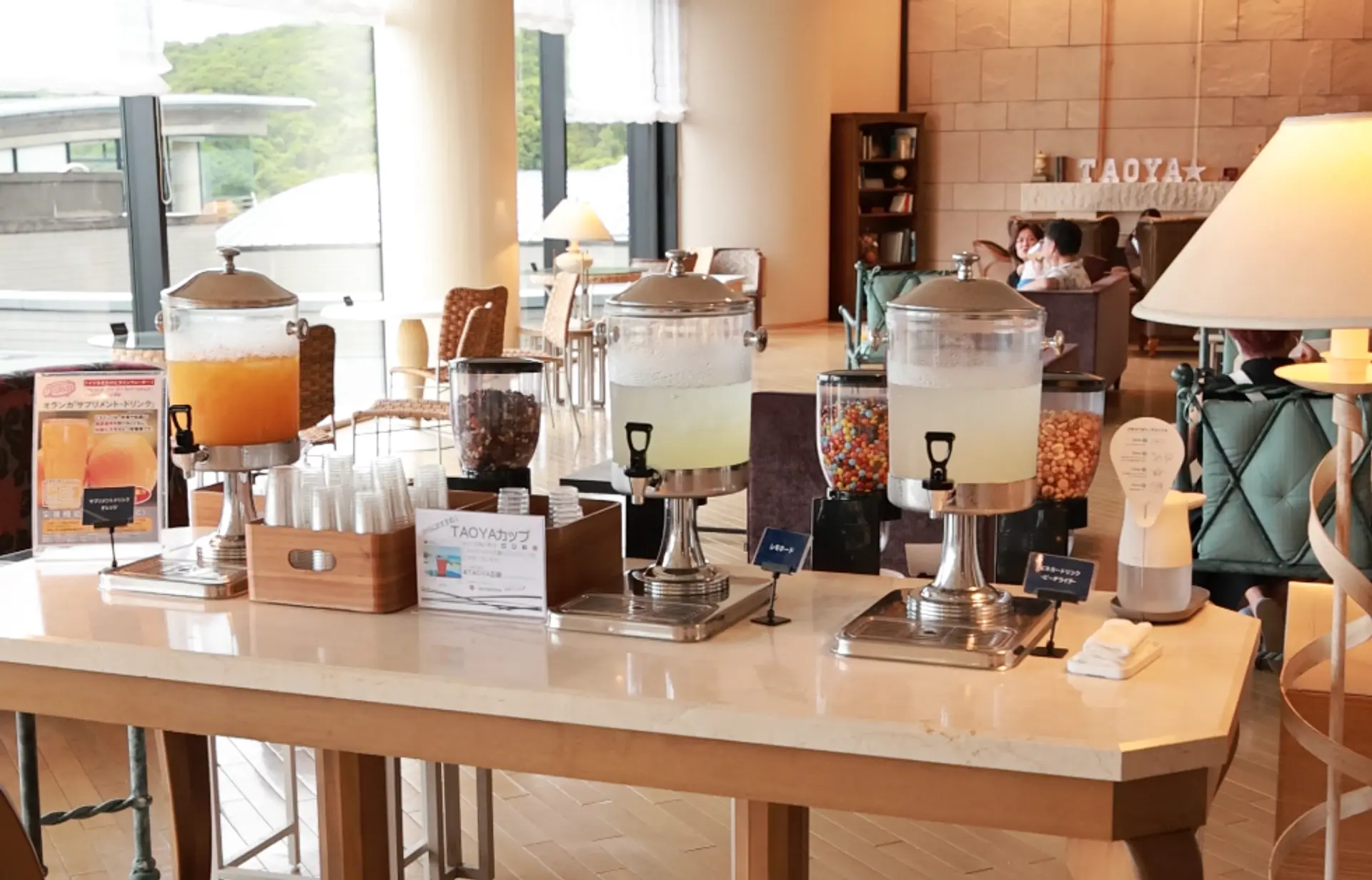 鳥羽市の「TAOYA志摩」では、ご到着時にウェルカムドリンクをロビーラウンジで受けられます。