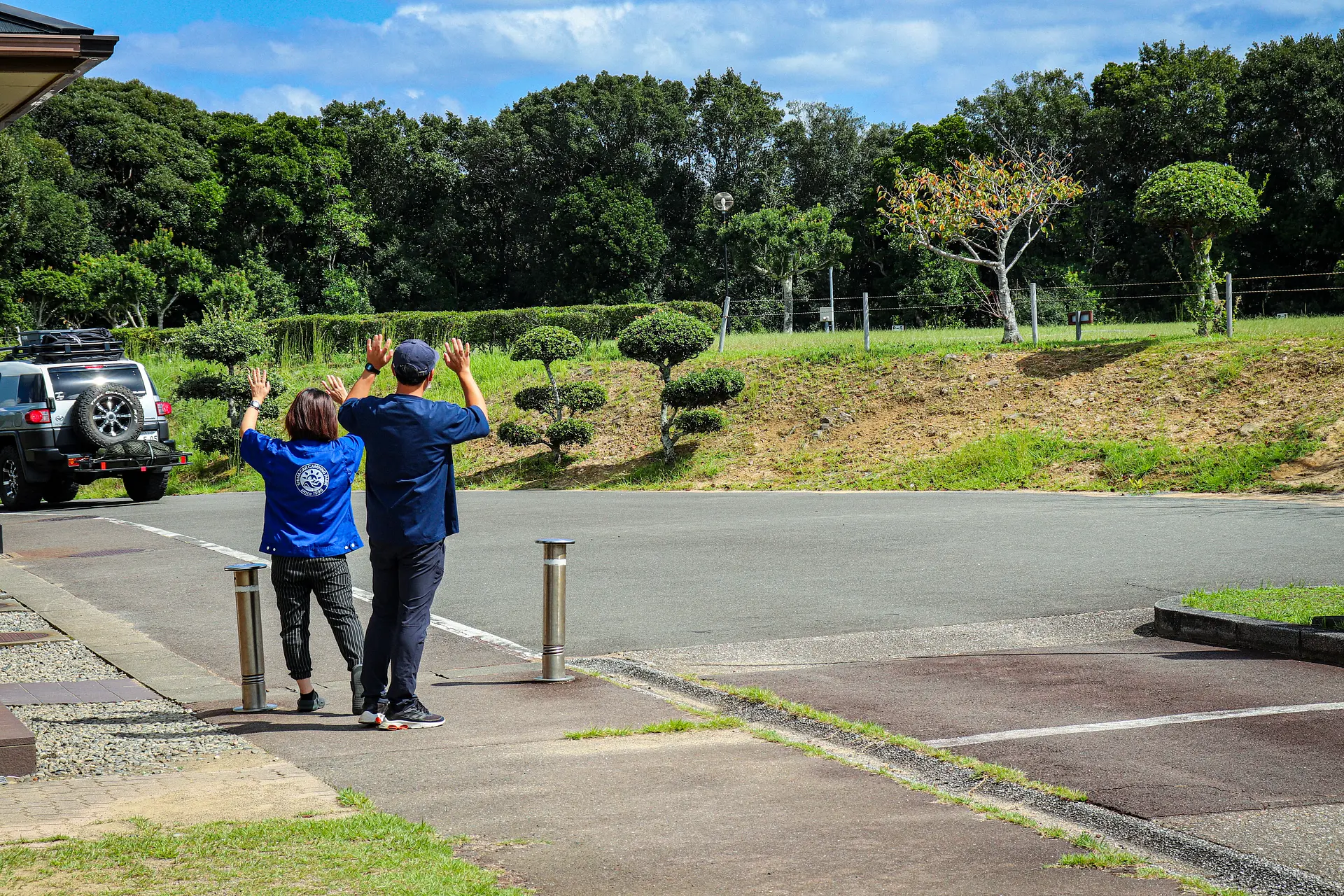 坂道を上ると、看板が見えました。到着するとスタッフさんが出迎えてくれます。