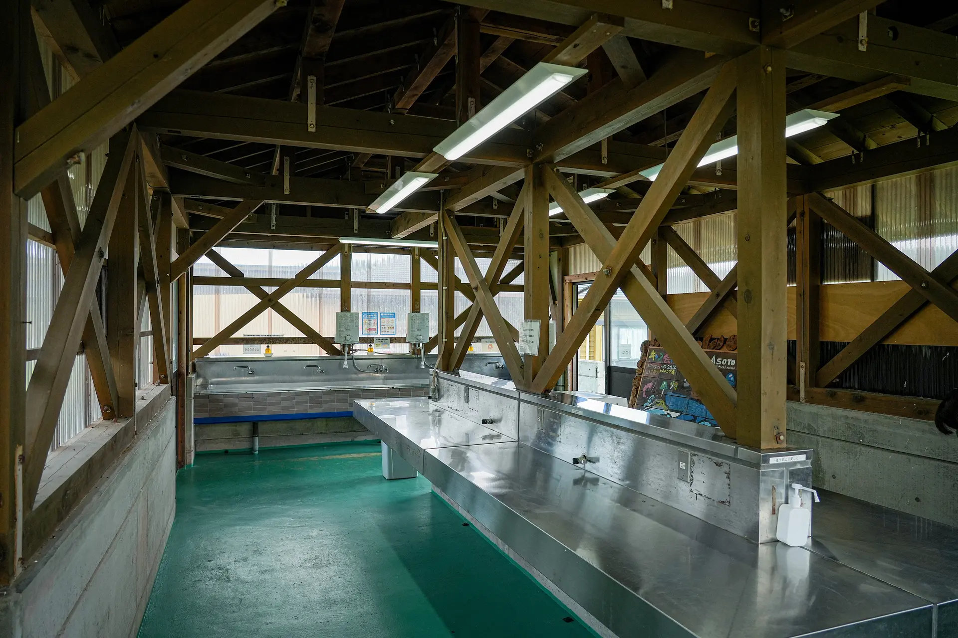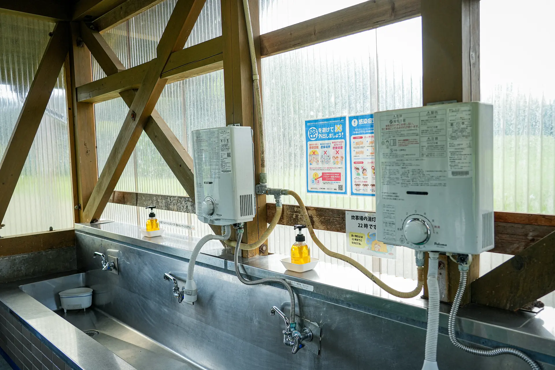 屋内の炊事場には給湯器4機と電子レンジ1台があります。