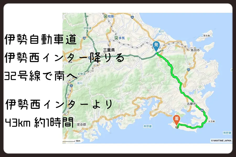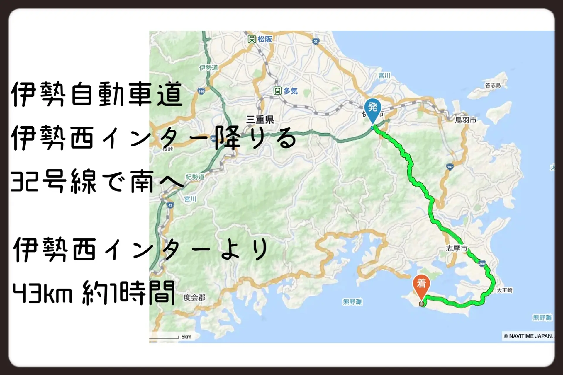 伊勢自動車道「伊勢西IC」より約43km、約1時間ほどの距離。関西圏や名古屋からのアクセスも可能です。