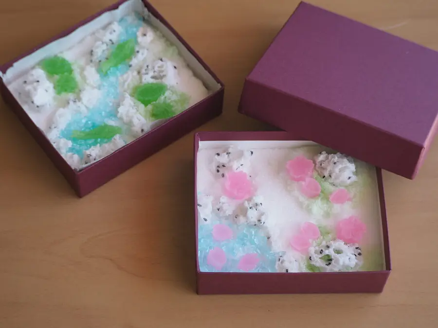 こもガク塾では、粒の大きさが異なるお砂糖、色鮮やかで柔らかい琥珀糖や、堅く岩に見立てたカルメラを使って、じぶんだけの箱庭を作るワークショップ「おさとうの庭」を開催します。