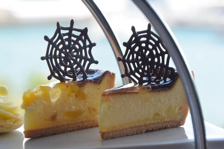 チーズケーキの中にごろごろした栗が入っていて、秋の味覚を感じることができる1品です。蜘蛛の巣モチーフのチョコが上に飾られていました!