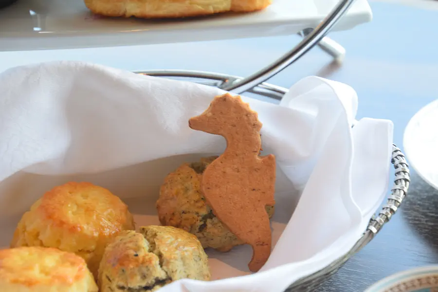 スコーンはバケットに入って3段ティースタンドとは別に盛られています。プレーンと紅茶の2種類です。スコーンはアフターヌンティーの定番お菓子ですよね♪