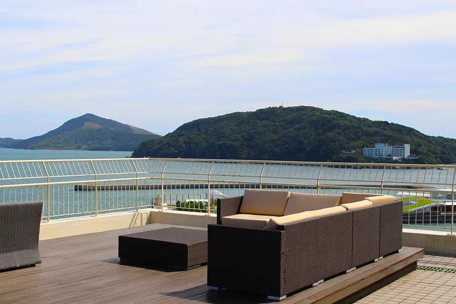 2階のエントランス奥にはオープンデッキがあり、日帰り客も利用することができます。潮風や波の音を感じながら海を眺めることができるので、ぜひ鳥羽国際ホテルに訪れた際はここにも立ち寄ってみてください。鳥羽の離島の島々を見渡すこともでき、タイミングが合えば、離島を行き交う伊勢湾フェリーを見ることもできますよ♪