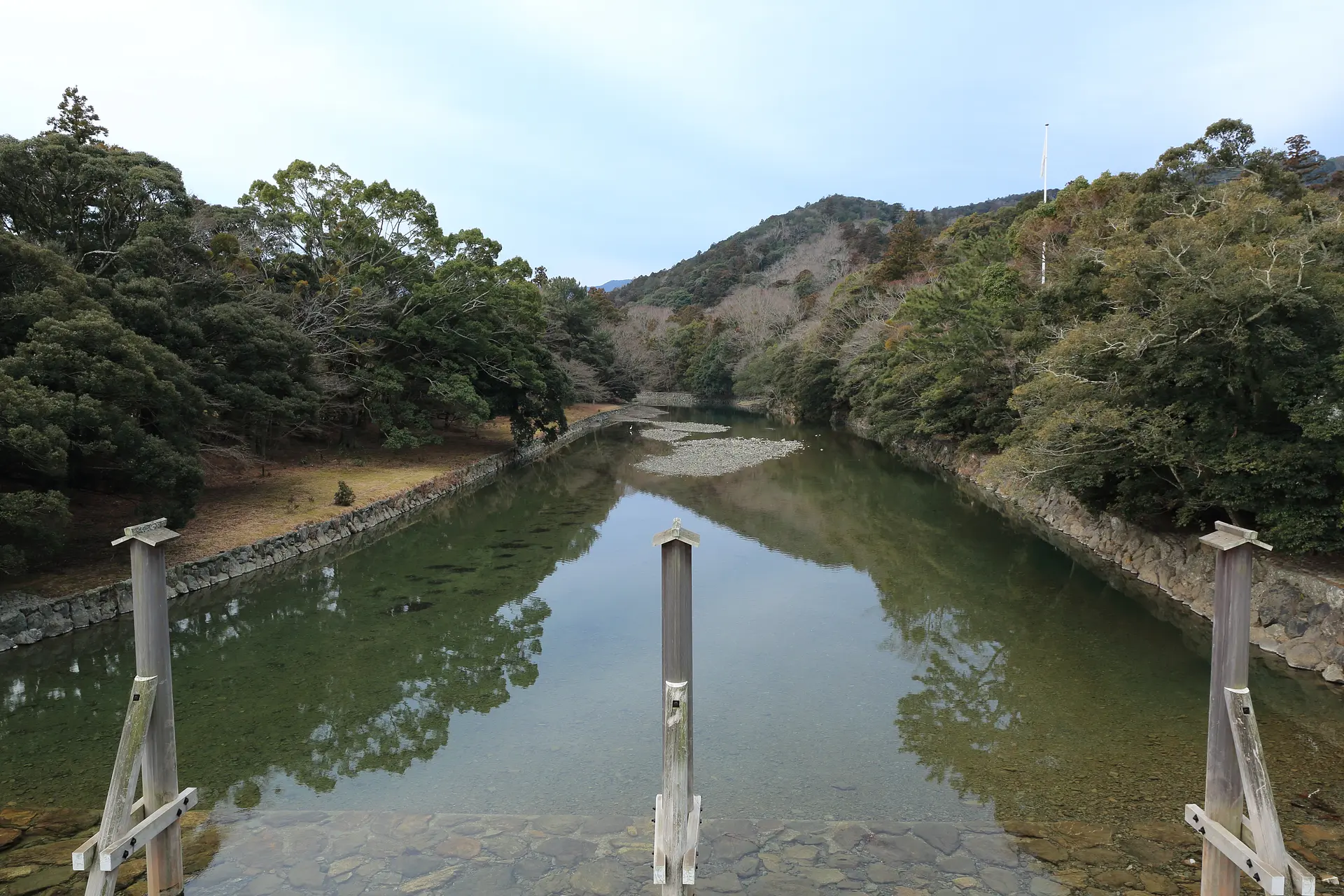 A9:五十鈴川にかかる宇治橋の上流に、小さな屋根が付いた柱が立っています。これは「木除杭(きよけぐい)」といい、名の通り五十鈴川が増水した際に、上流から流れてくる流木などを遮り橋脚を守る役割があります。