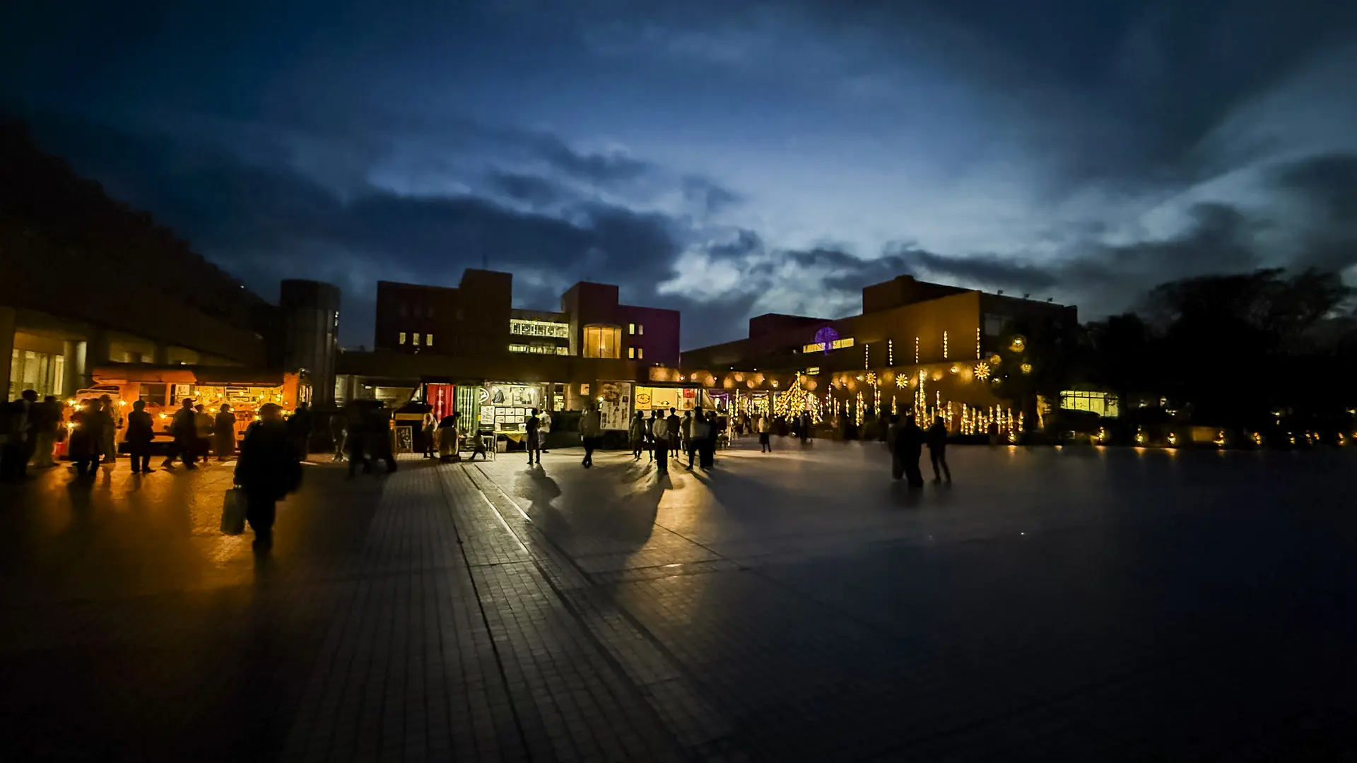 竹あかりは祝祭広場がメイン会場になります。文化会館側の大きい広場です。
