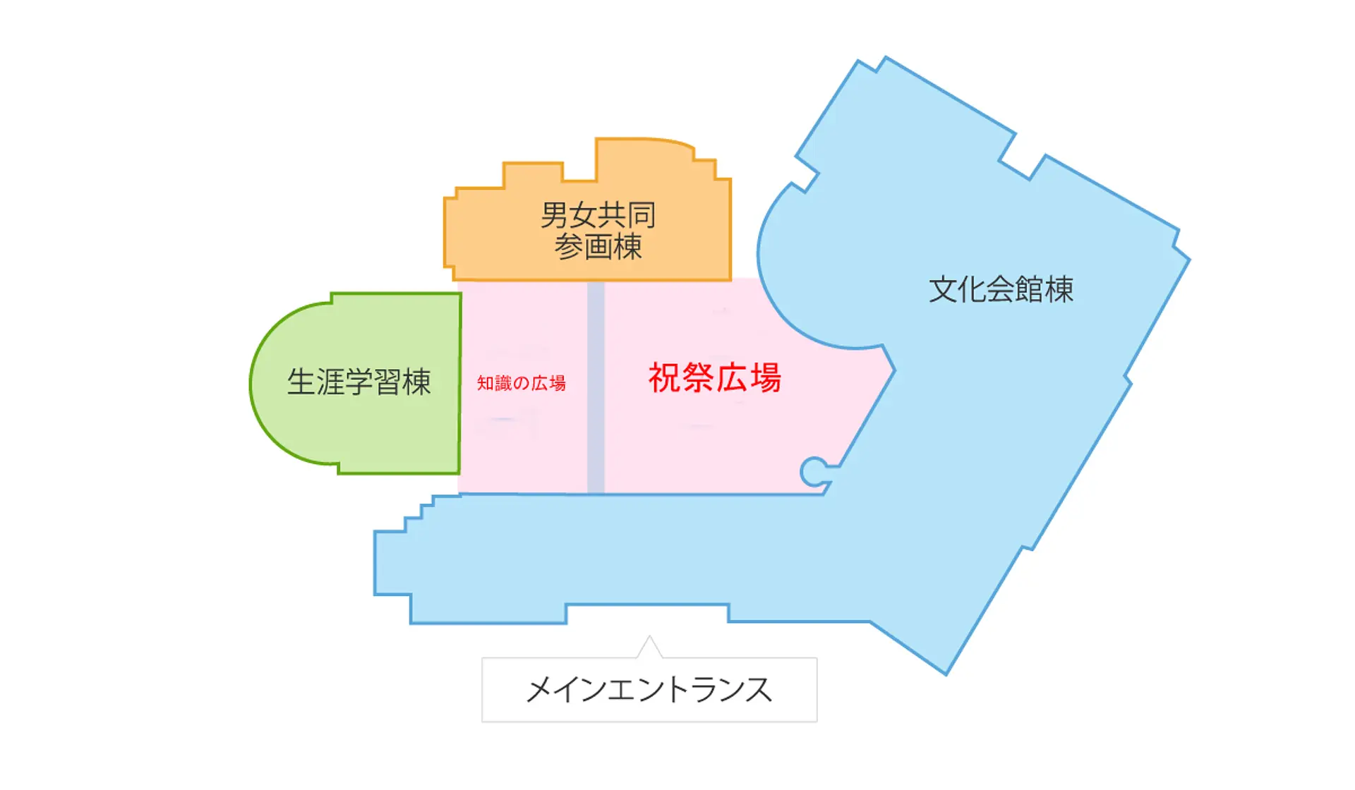 一言で「そうぶん」といっても「どこ?」と思われる方もいらっしゃるかもしれません。また、「けんぶん」って言われる方もいらっしゃるようです。「そうぶん」は、三重県総合文化センターの略で、いろいろな施設が集まっている場所です。建物は大きく3つに分かれます。大ホールのある文化会館棟(青色表示)、県立図書館などのある生涯学習センター棟(黄緑色表示)、男女共同参画センター「フレンテみえ」棟(オレンジ色表示)です。