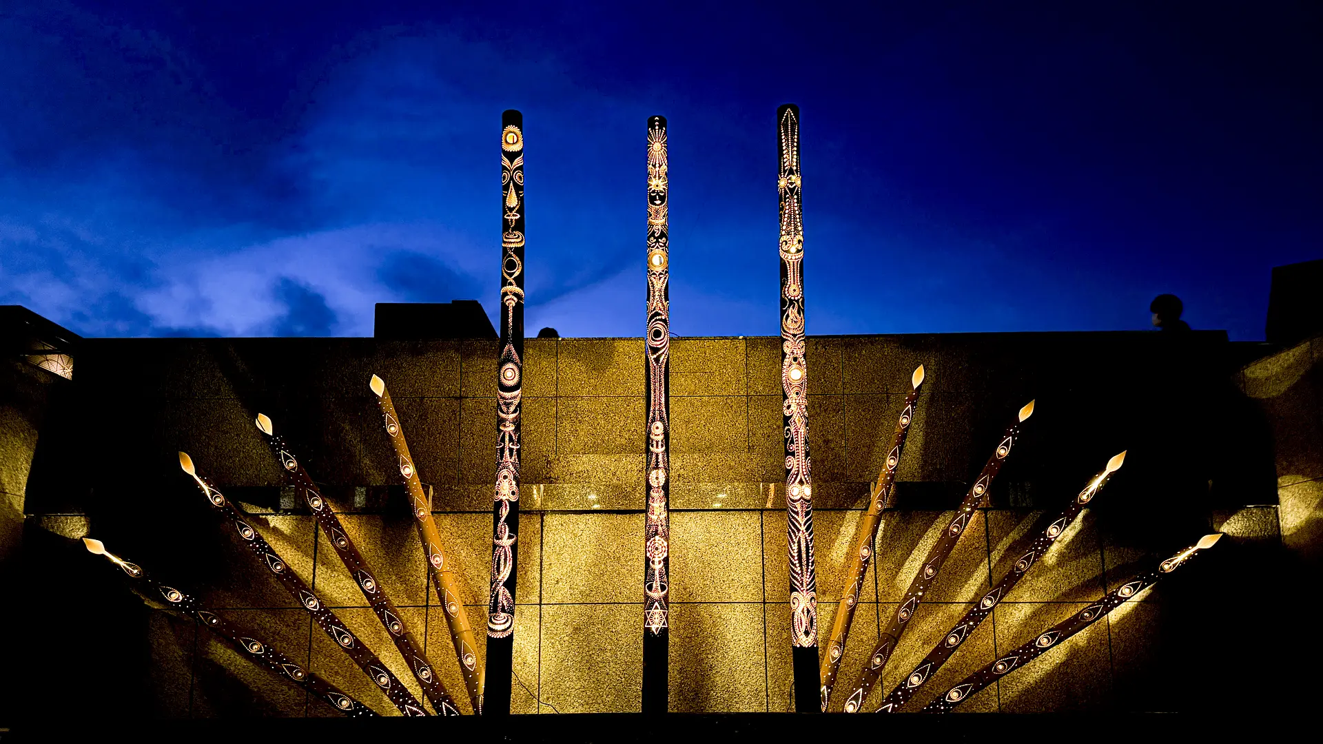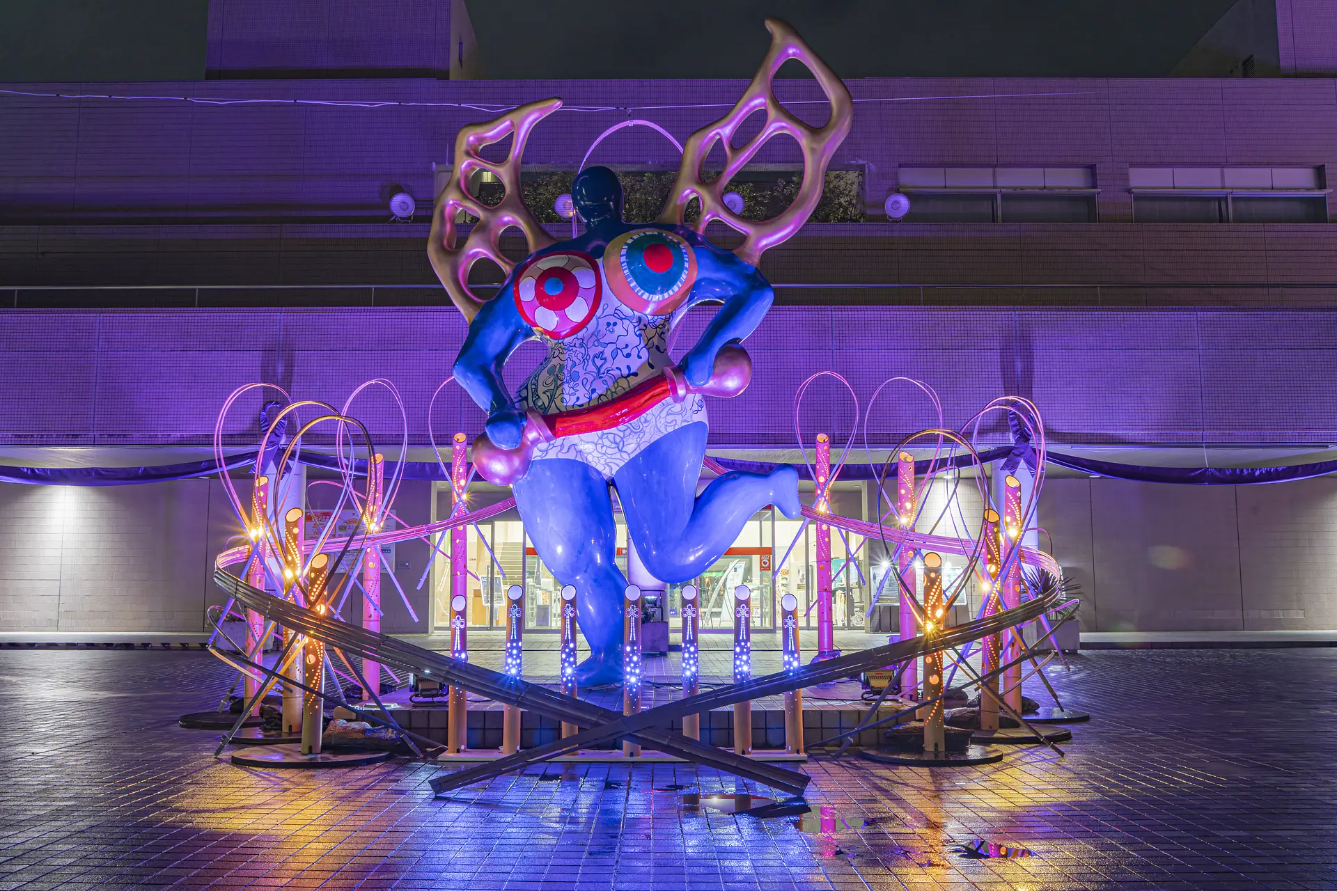 まずはメインエントランスの正面階段から。正面の竹あかりは昨年のメインモニュメント。メインの3本の竹あかりは、天照大神など3つの祖先となる神々が表現されているそうです。大きなオブジェに圧倒されました。