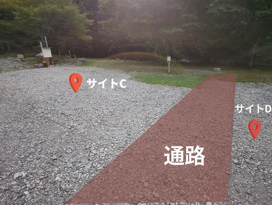 区画サイトCとDは、センターハウスに最も近い場所です。また川へ降りる階段も近く、小さいお子様連れのご家族にオススメです。ちなみに今回私が利用させて頂いたのがサイトDです。