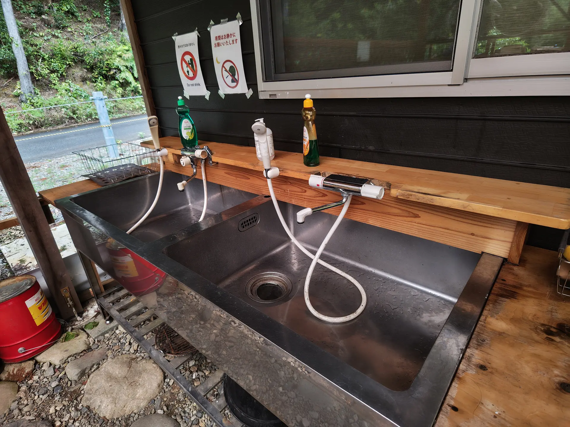炊事場はセンターハウス向かって左側にあります。屋根もあるので雨の日でも安心。お湯も出ますし、シャワーも使えるので、川遊びの後に足元を洗ったり、大きな鍋や鉄板を洗う際にも便利ですね!