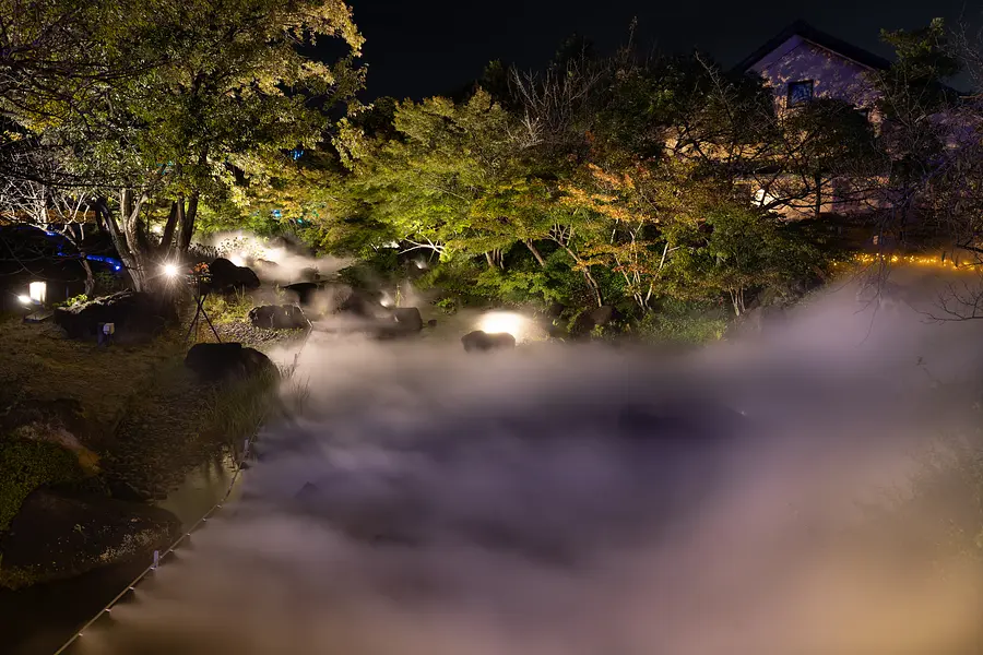 なばなの里の入村ゲートから「里の湯」に至る約200mのせせらぎには幻想的な霧が出現します。