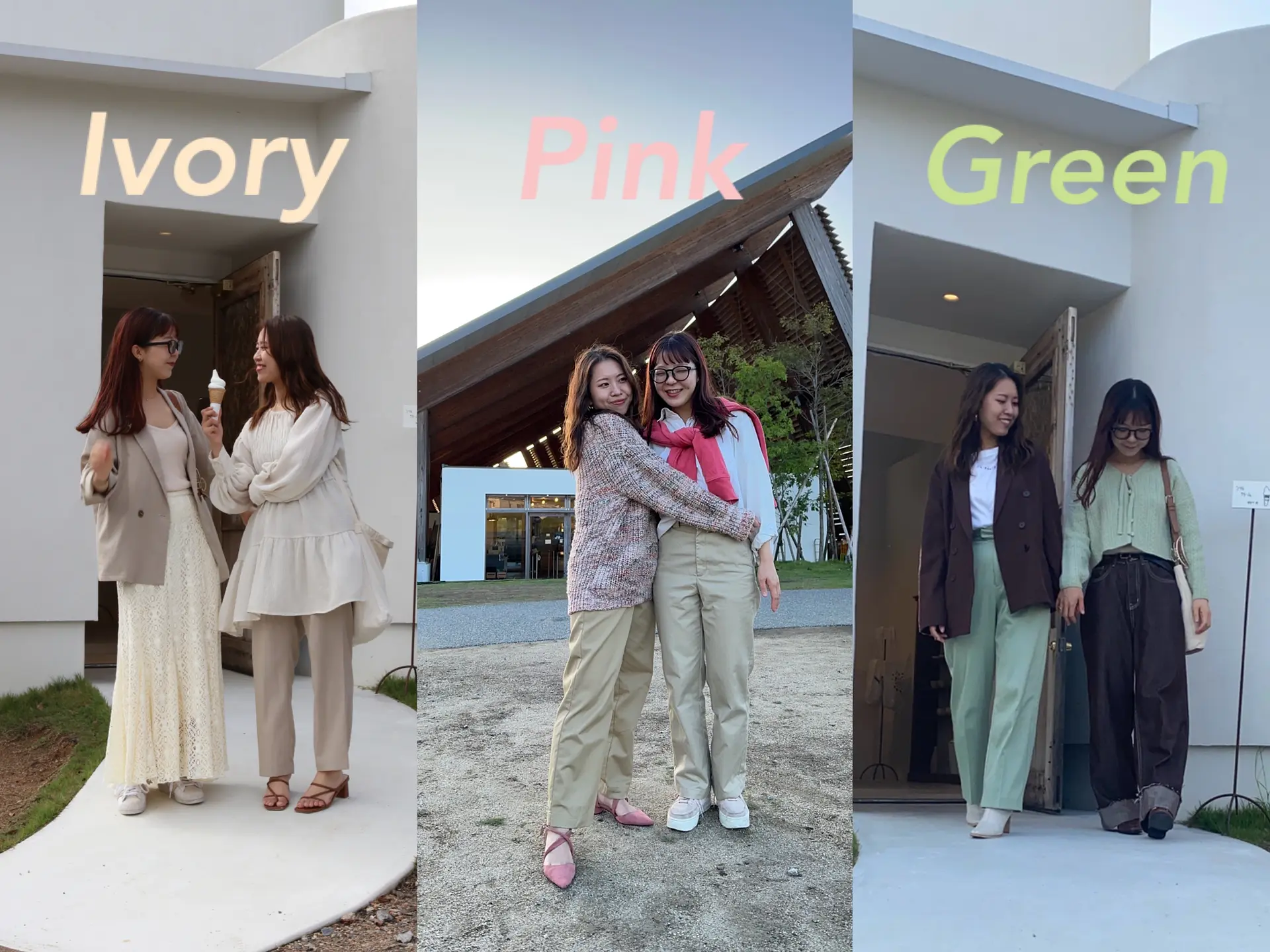 おしゃれを楽しむカラーコーデは、ピンクとグリーンでVISONの美しい村に馴染むような色を選んでみました!