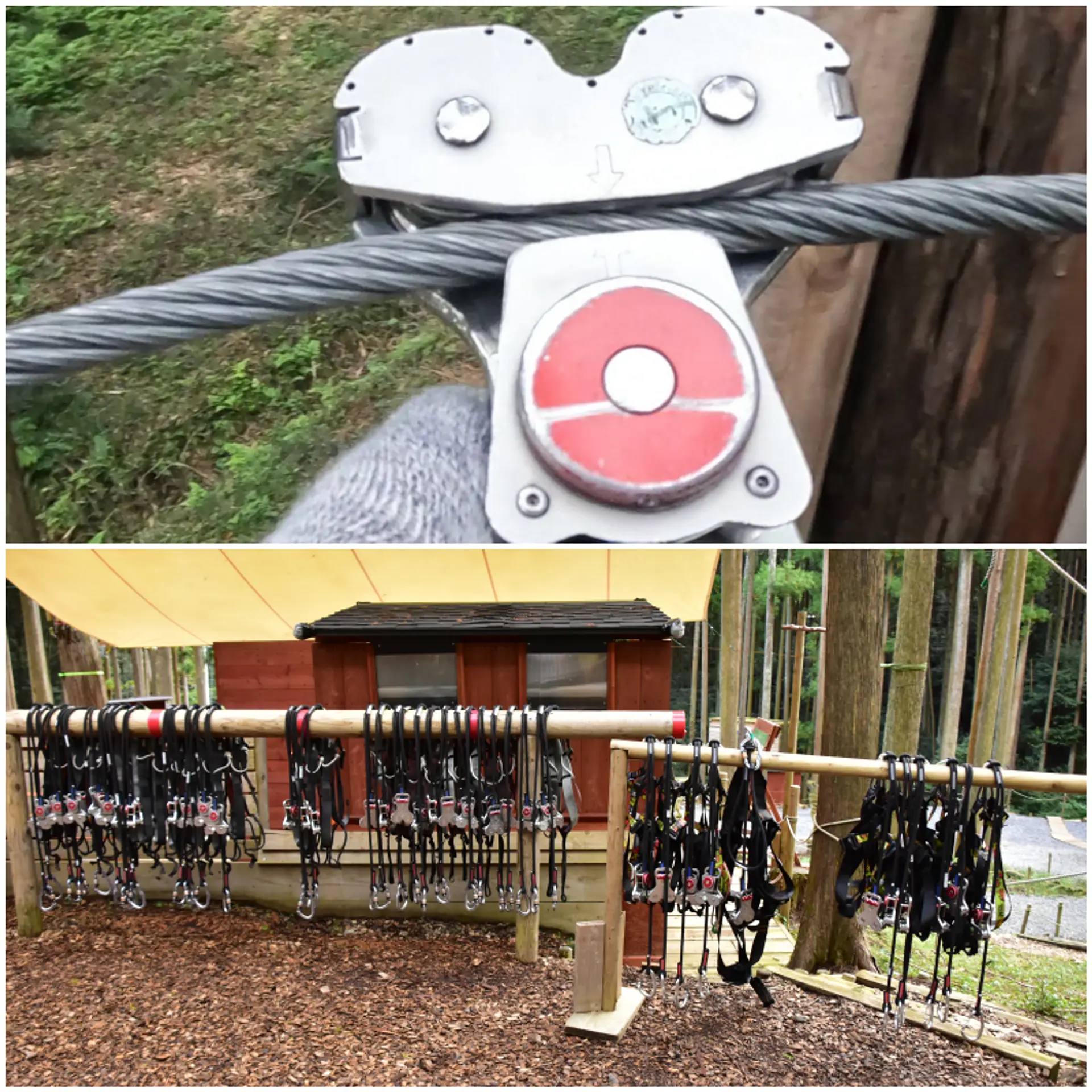 プーリーとは写真のように予め敷設されているワイヤーを滑らせるように使う「滑車」で、各コースの初め~終わりまで外す事ができないようになっています。
