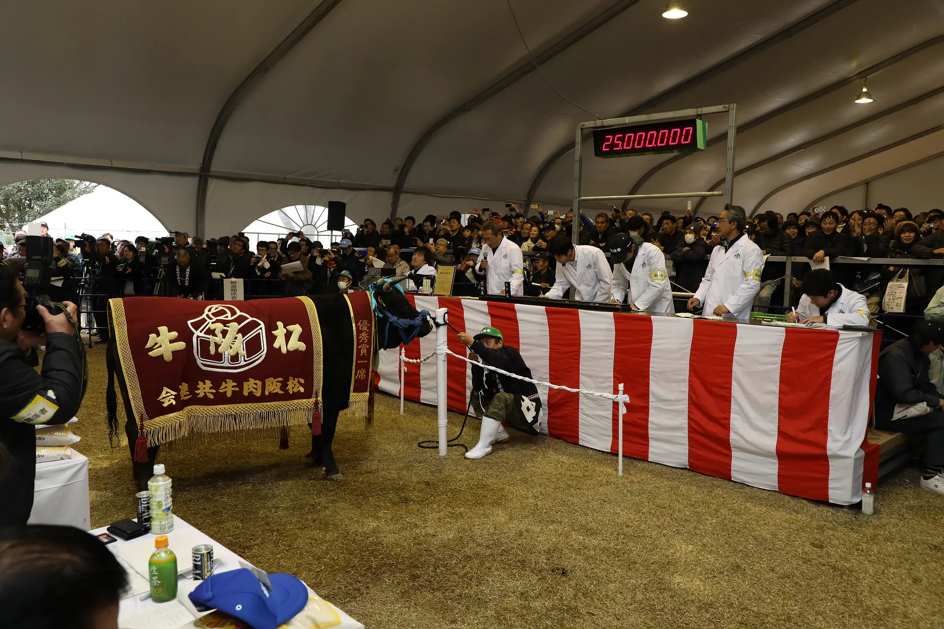高値で売られる優秀賞の牛ですが、特に1席の牛は値段が高く、昨年は3,032万円で落札されました。ちなみに、過去最高の落札金額は2002年の5,000万円だそう。「今年は○○万円で落札!」といったニュースがテレビや新聞で報道されるなど、全国的にも注目を集める松阪の一大イベントです。