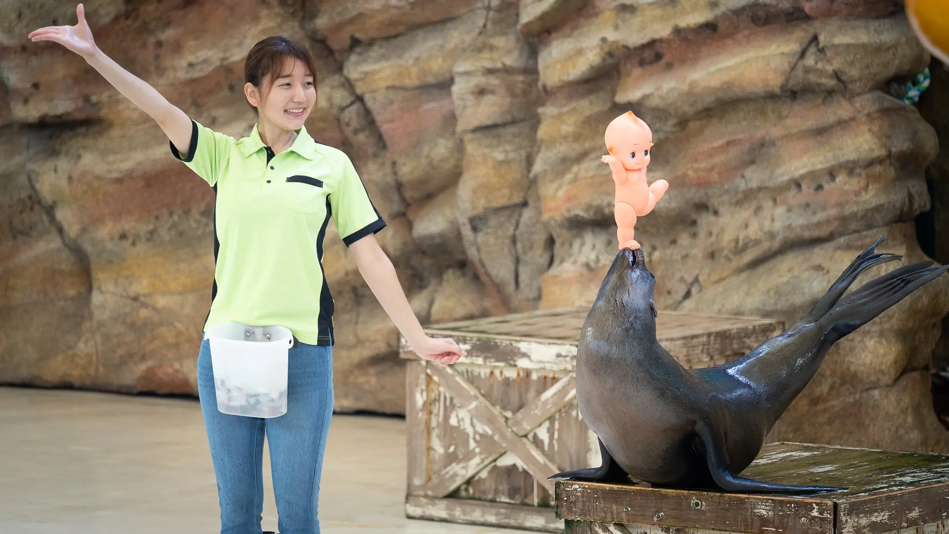 アシカショーでは水中から空中のボールに向かってハイジャンプしたり、遠くから投げられた輪を連続でキャッチしたりとトレーナーさんとの息もバッチリ!