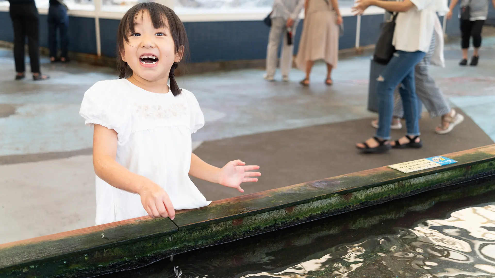 コチラでは、海に住む様々な生き物たちが飼育された水槽に直接手を入れることができるんです。