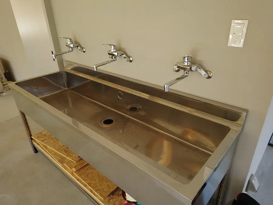 ペグやカート、靴裏についた泥落としなどに使える洗い場もありますので、大きいものや汚れが激しいものは流し台ではなく、こちらをご利用ください。