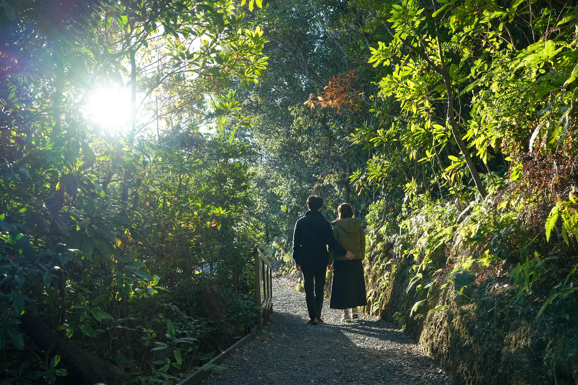 志摩観光ホテルの3館を結ぶ庭園散策へ。約2000坪の広大な敷地。草花の香りを全身に感じ、普段の生活からしばしお別れ。