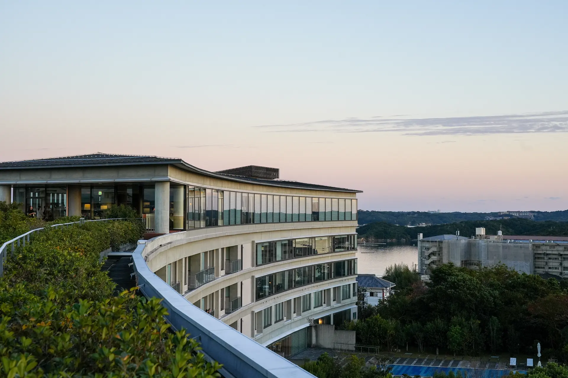 近鉄賢島駅を通過し、坂道を登るとそこに見えてきたのは、広い敷地とリゾート感あふれる佇まい。
