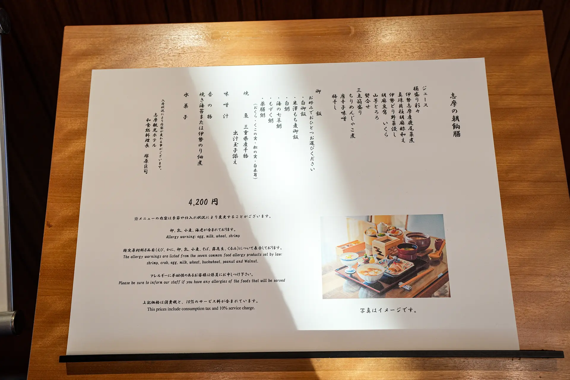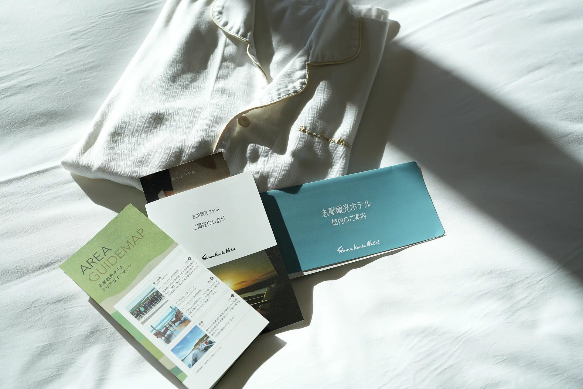 チェックイン時にいただいた滞在のしおりを開くと「志摩時間へようこそ」の文字が。ラウンジをはじめ滞在中多くのおもてなしやサービスの案内に、期待が高まります。