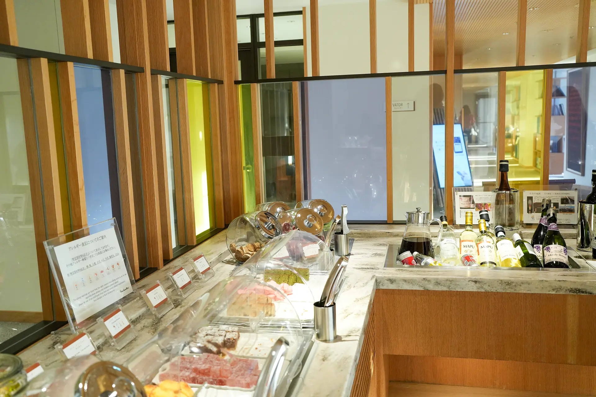 スナックやプティケーキ、三重の銘菓、アルコールやジュースなどが時間によってアイテムを変え用意されています。