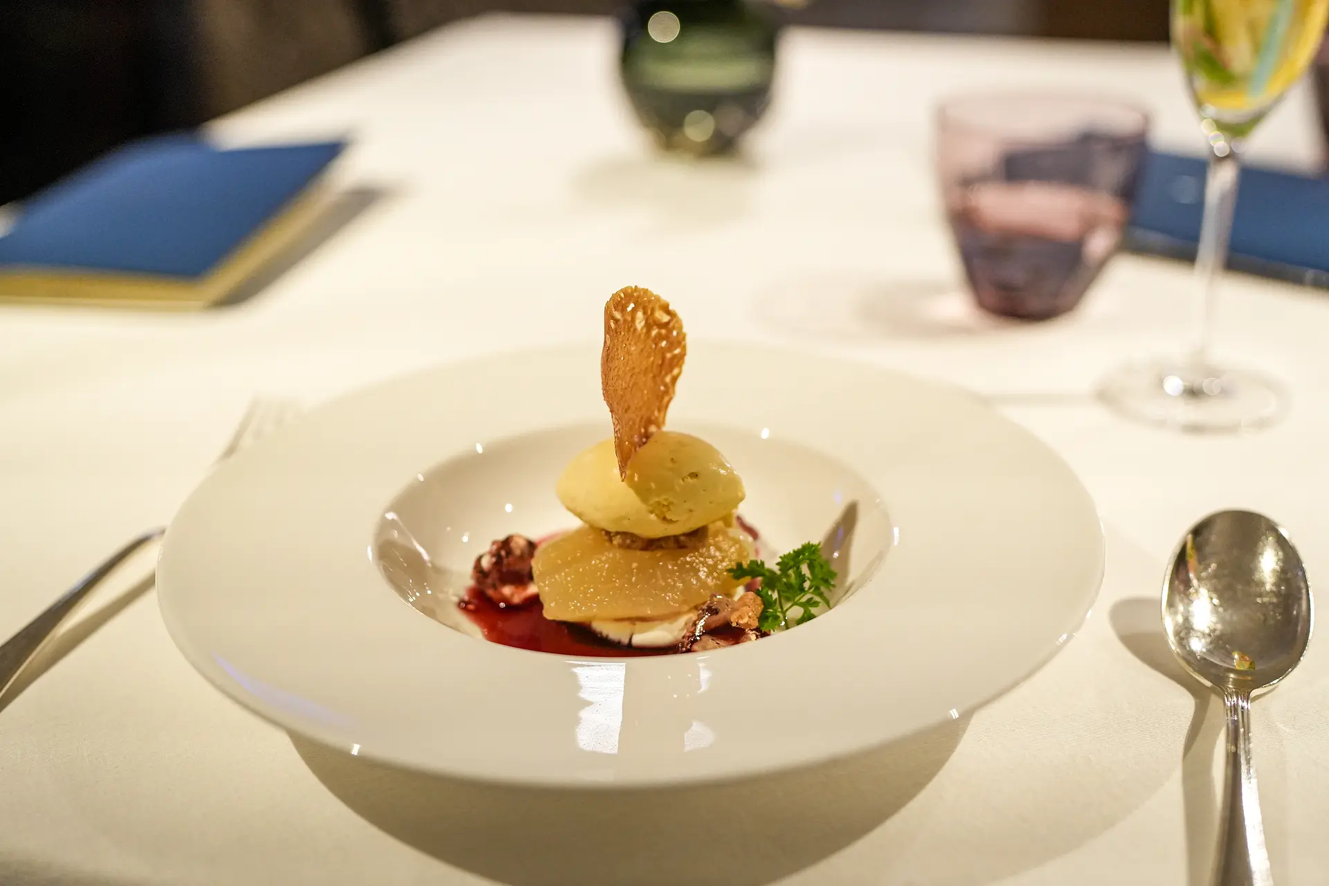 バター香るパイ生地と、鹿のファルスとナッツの食感が一体となったパテの王様と呼ばれる料理。生地がしっかり香ばしく焼きこまれていながら、コンソメゼリーは滑らかな旨味。