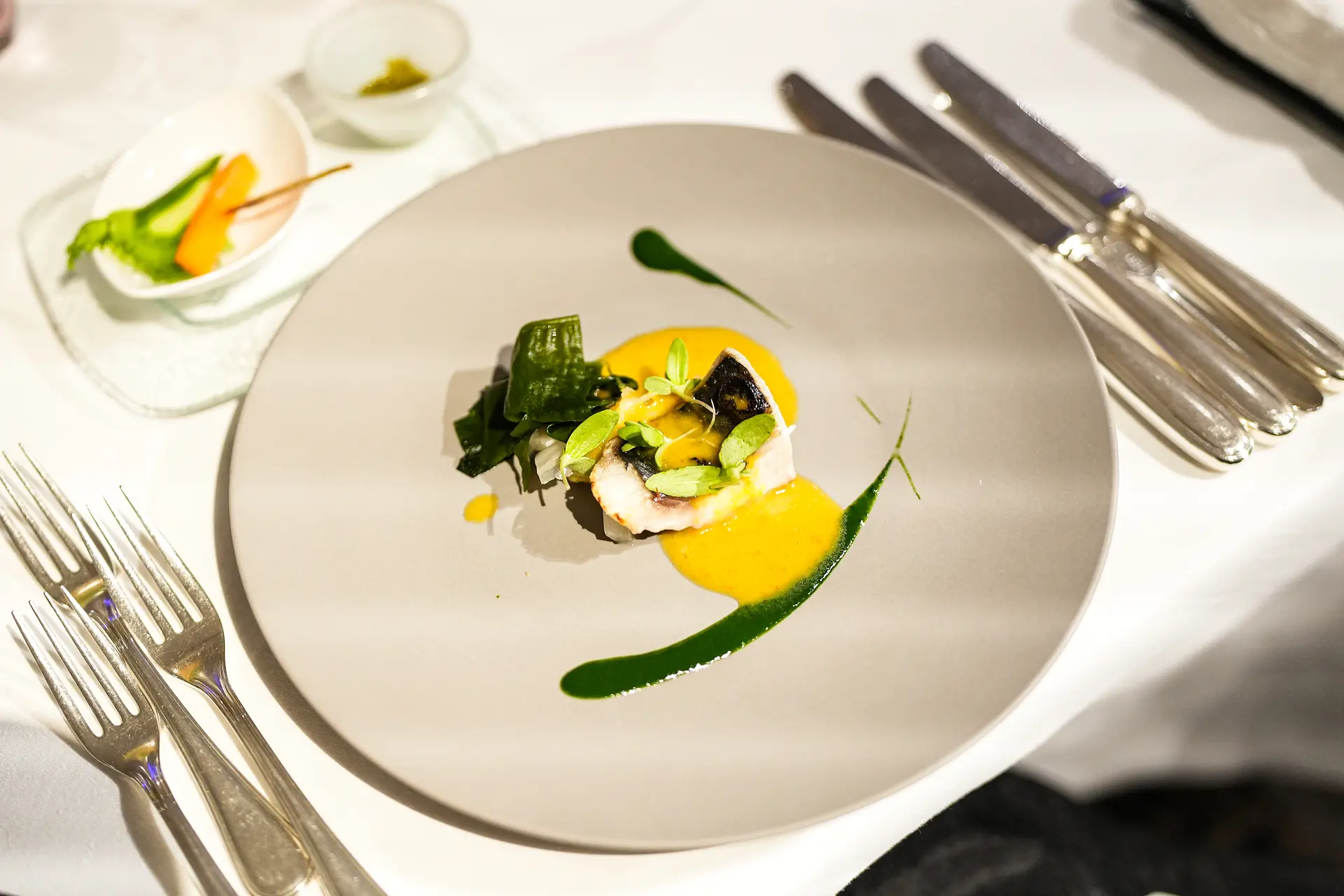 香ばしく焼き上げられた鰆と柑橘ソースが絶妙。「地元食材と伊勢志摩の文化、生産者さんの思いなどをお伝えできる様に。」シェフの想いの詰まった料理の数々。