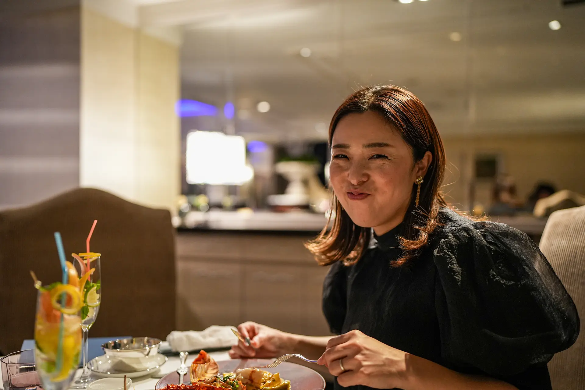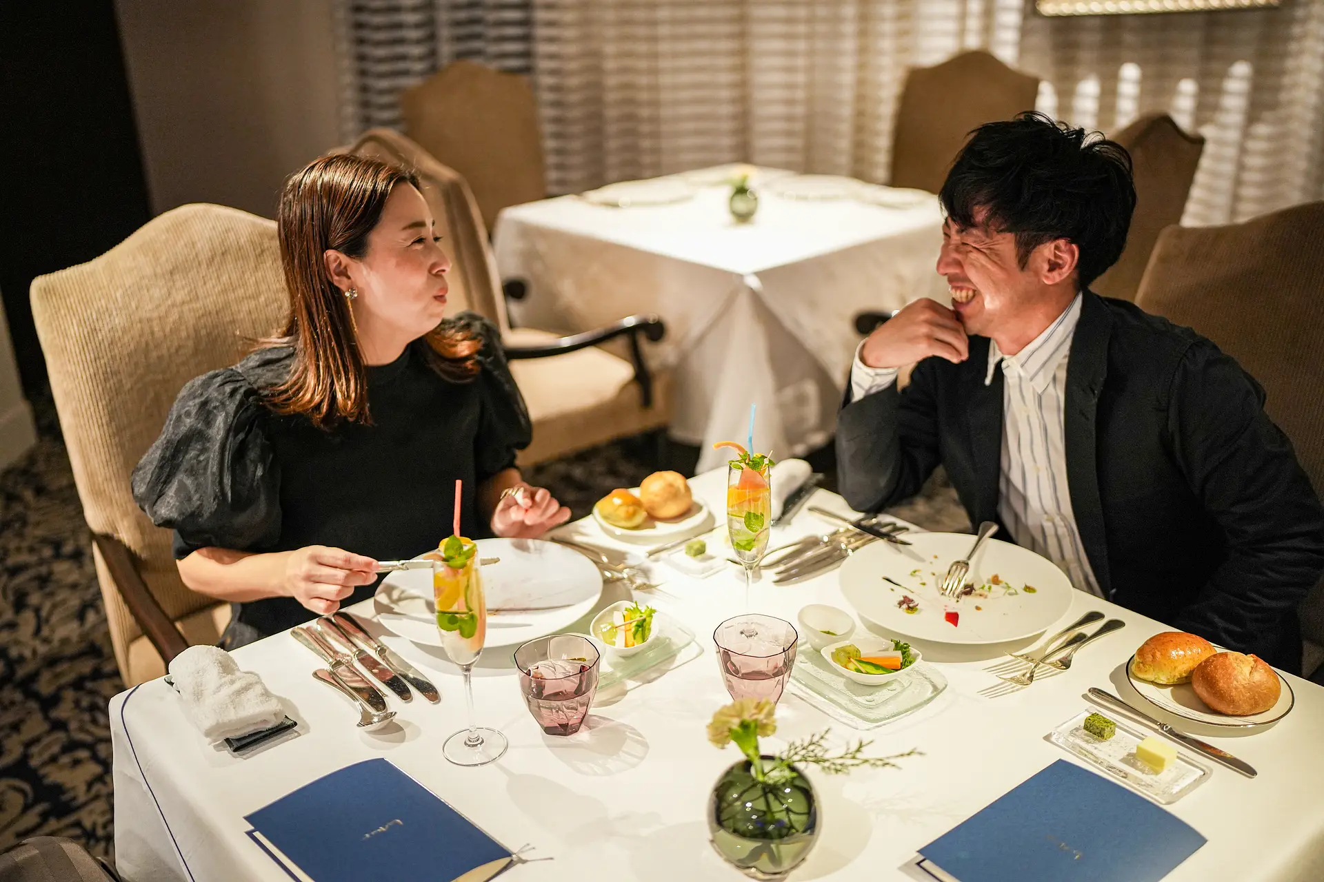 フレンチガストロノミーにご満悦。幸せに満ち溢れた笑顔。