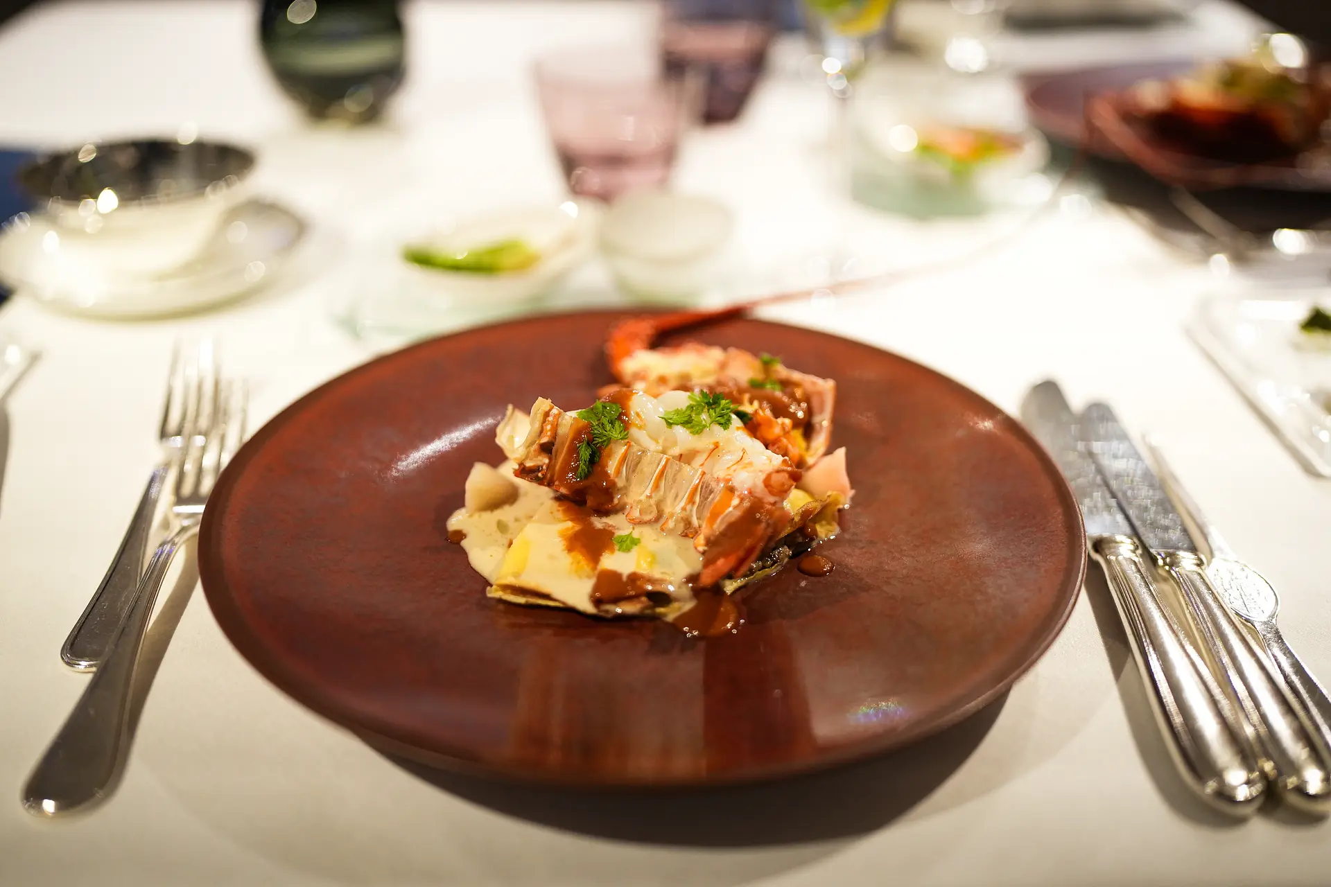 コンソメを卵で固めたロワイアルに伊勢海老の身が盛り付けられた皿に、上からスープを注ぎます。湯気とともに広がる香り、とても濃厚で伊勢海老の風味と旨みを堪能。