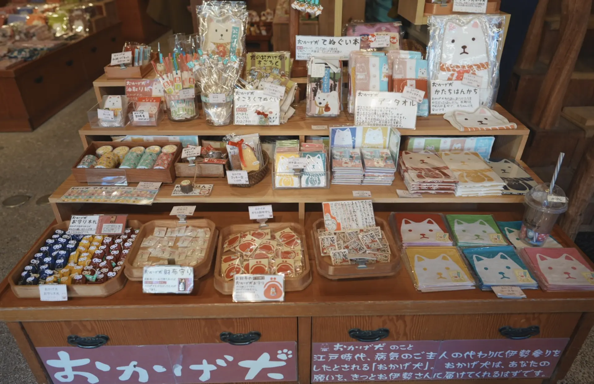 おみやげやにはたくさんのおかげ犬グッズがズラリ。