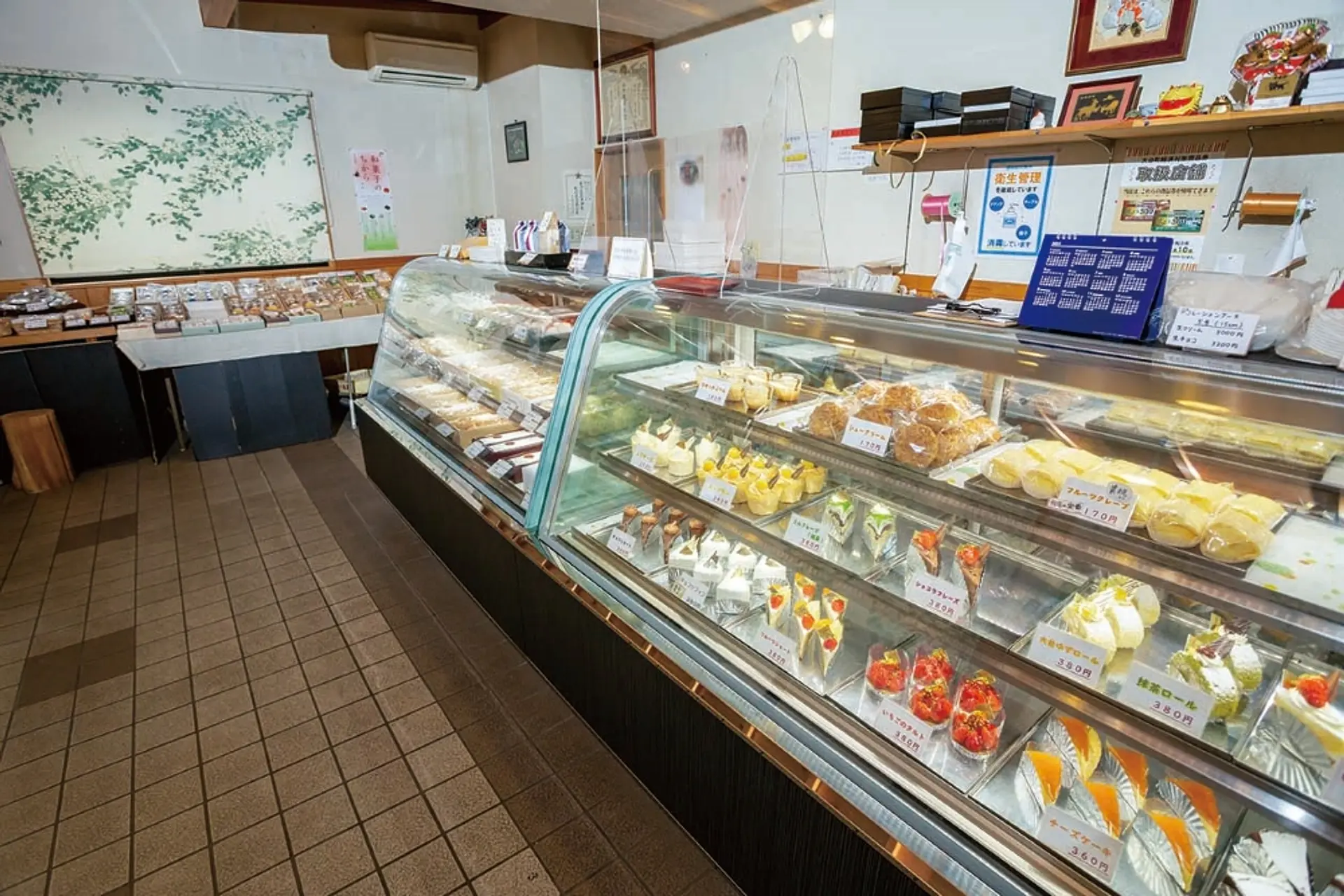 道の駅の向かい側にある老舗和洋菓子店「モンマルトル亀屋」では、地元ならではの和菓子・ケーキ・焼き菓子がずらりと並んでいます。