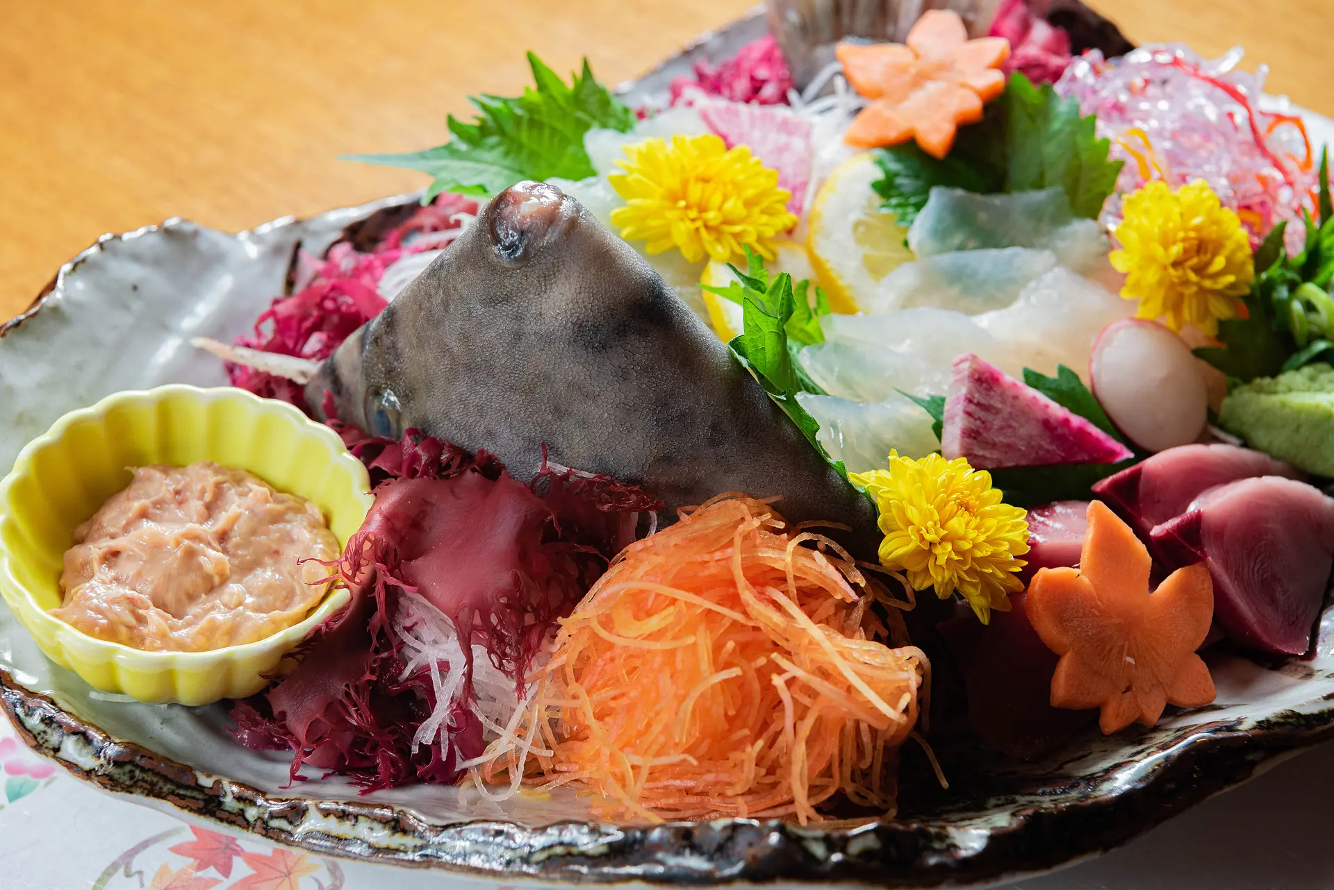 煮つけにして食されることの多いカワハギですが、肝まで生で食べられるのは漁場の近くにある旅館だからこそ。
