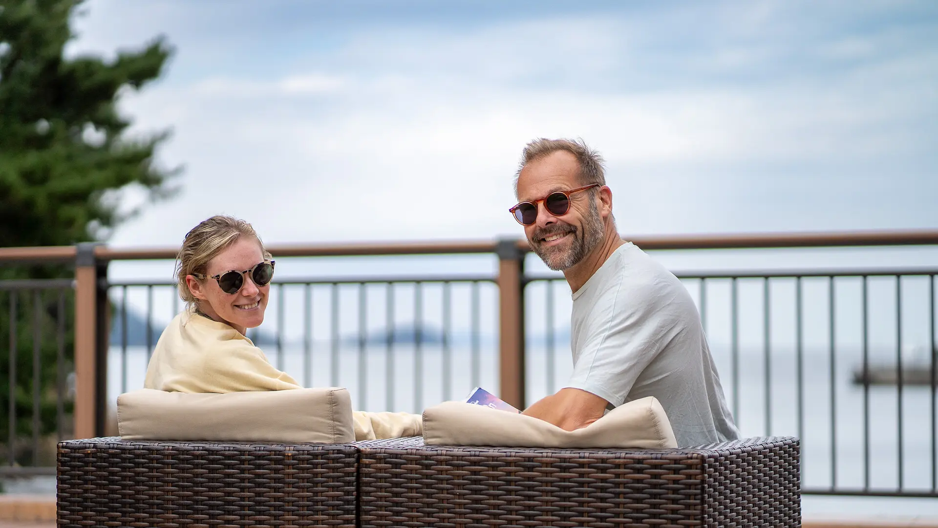 キラキラと煌めく夜のマリンターミナルや船の灯りでテラスはロマンティックな雰囲気に!