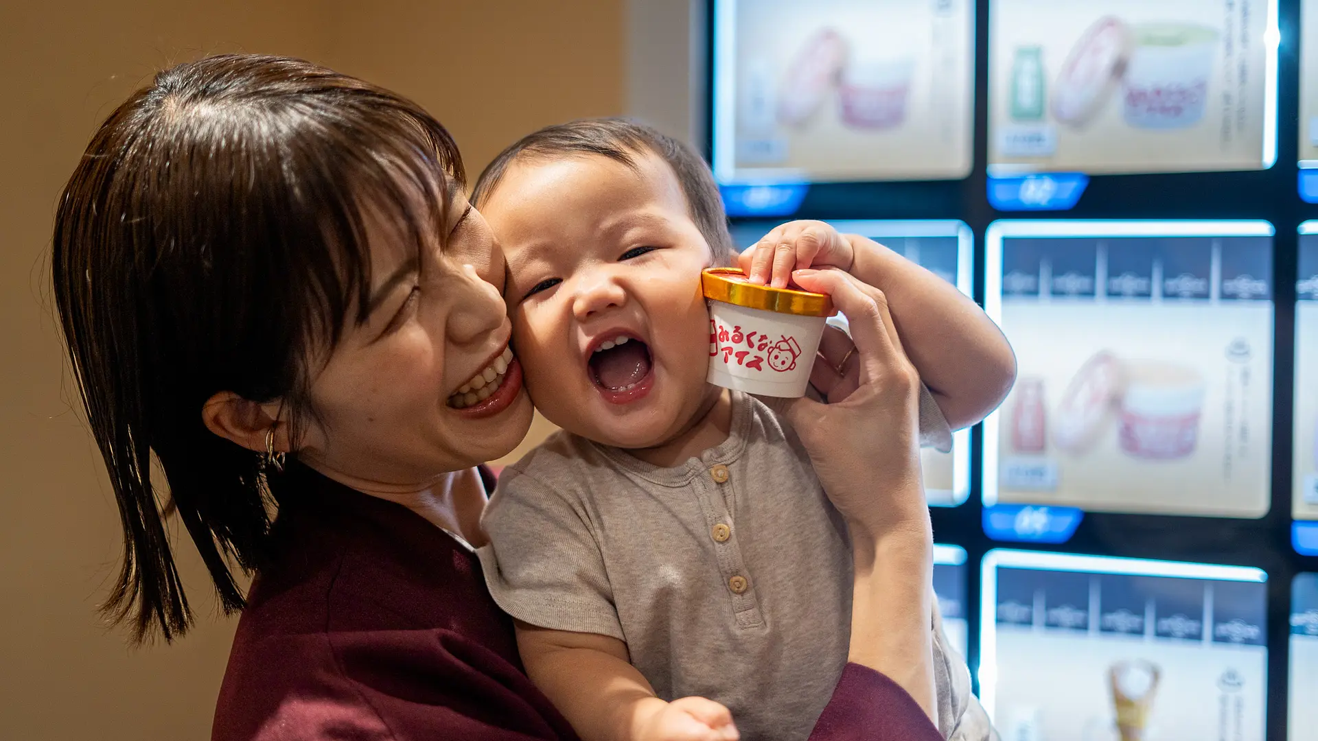 濃厚なミルクの味が特徴の山村乳業のアイスを手に妻と我が子はこの表情!