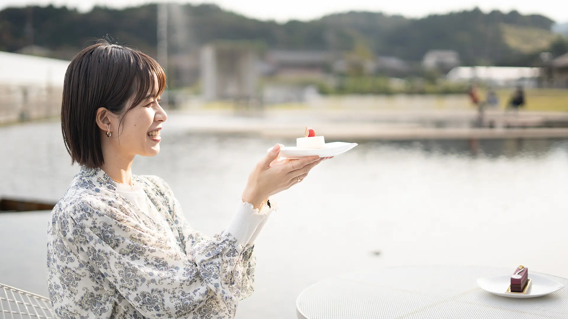 今回の取材では、自然豊かな景色と水に囲まれた開放感あるテラス席で辻口シェフの代表作である「セラヴィ」と、「カシスショコラ」を頂きました。