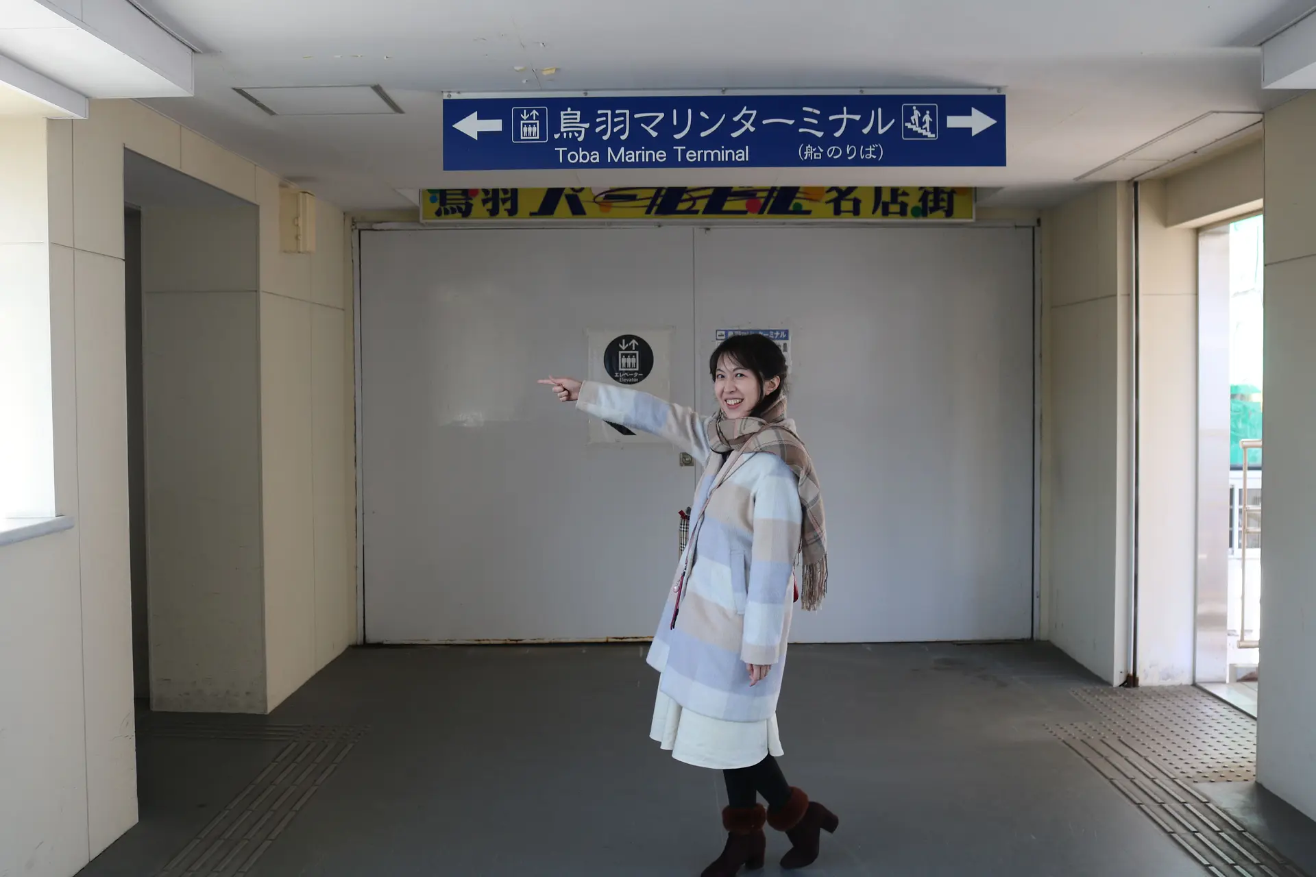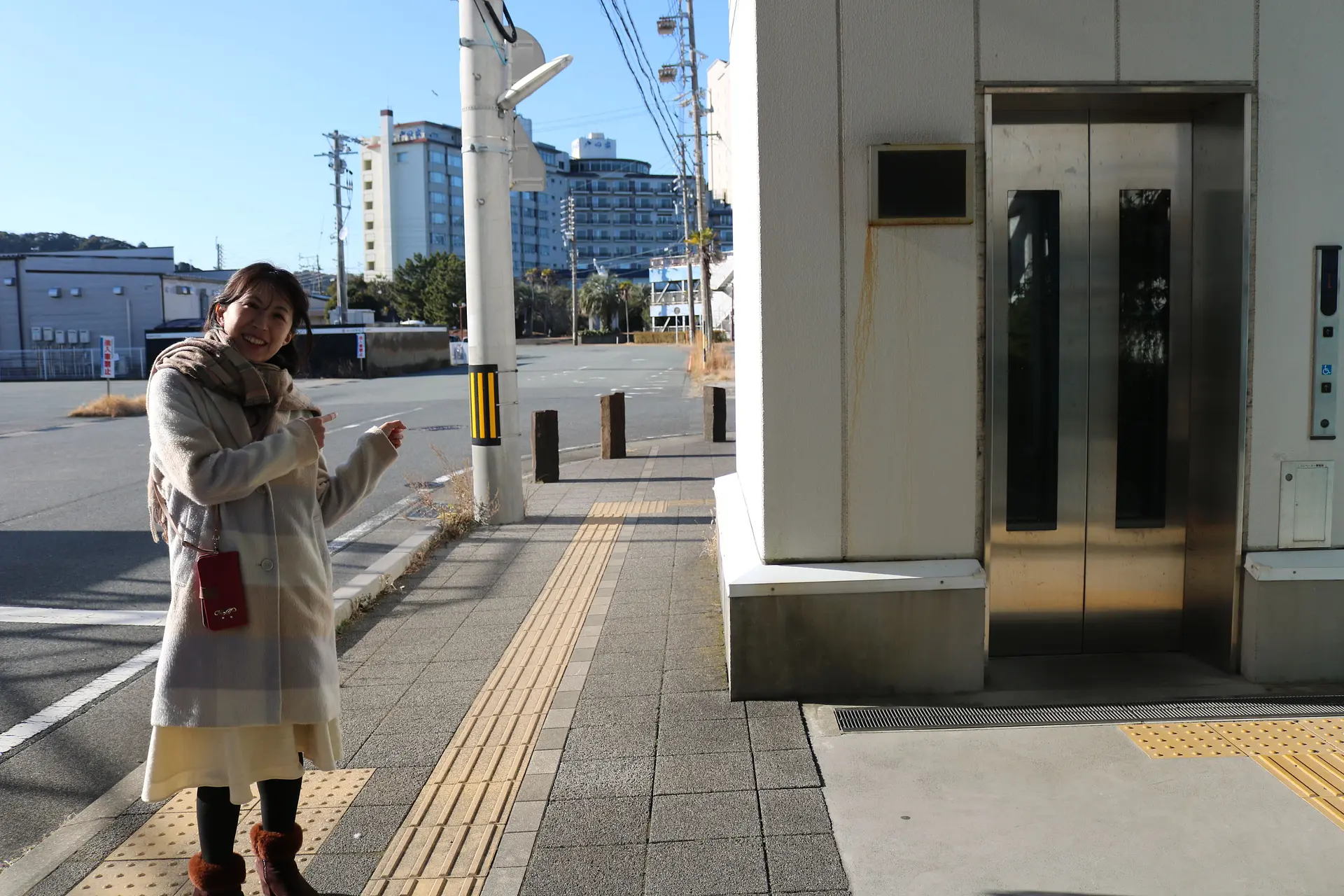 まず鳥羽駅の連絡橋を渡ると、エレベーターがあるのでそこを降りてください。