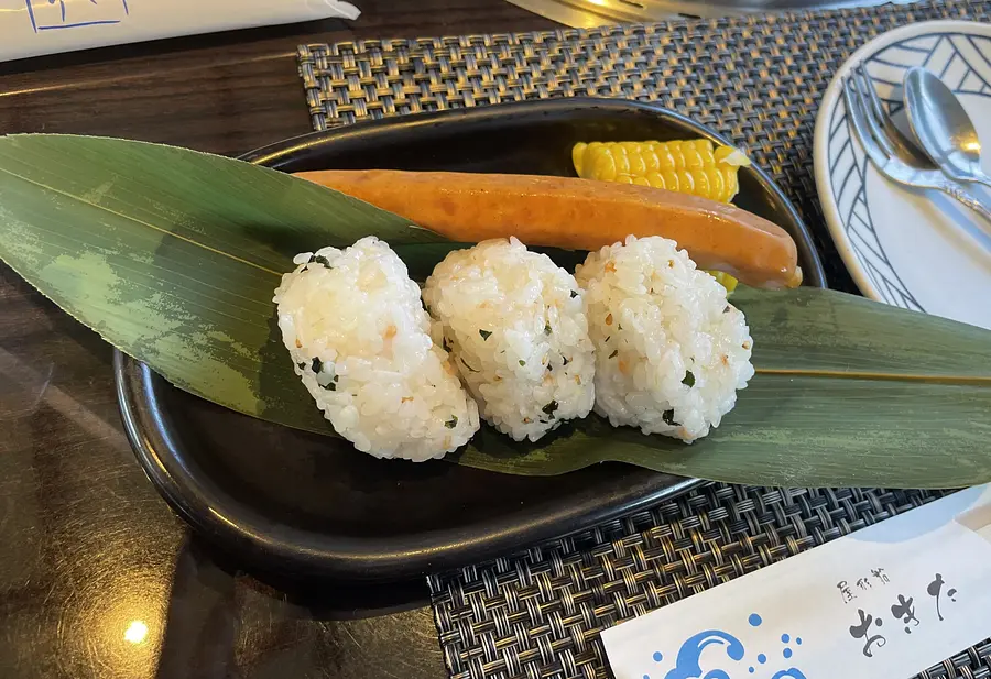 小さいお子さまでも食べやすいように小さくにぎっていただいた美味しいおにぎりと子供の大好きなウインナーととうもろこしのセットも、子供たちに出していただきとても大満足でした。